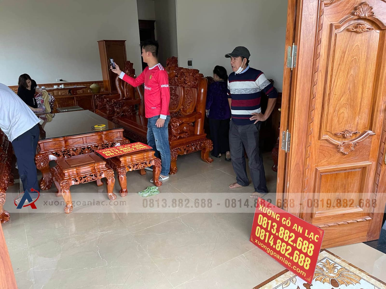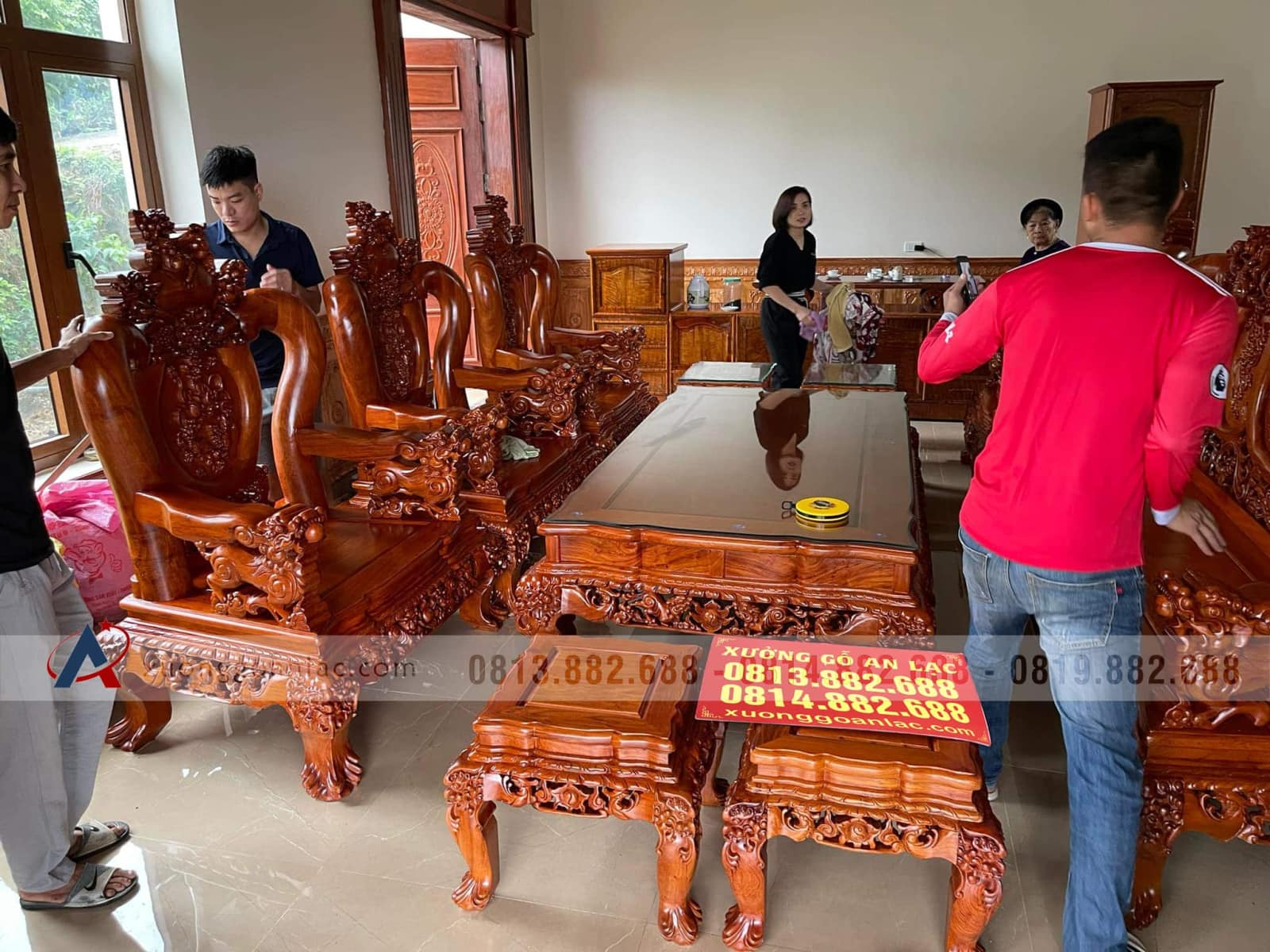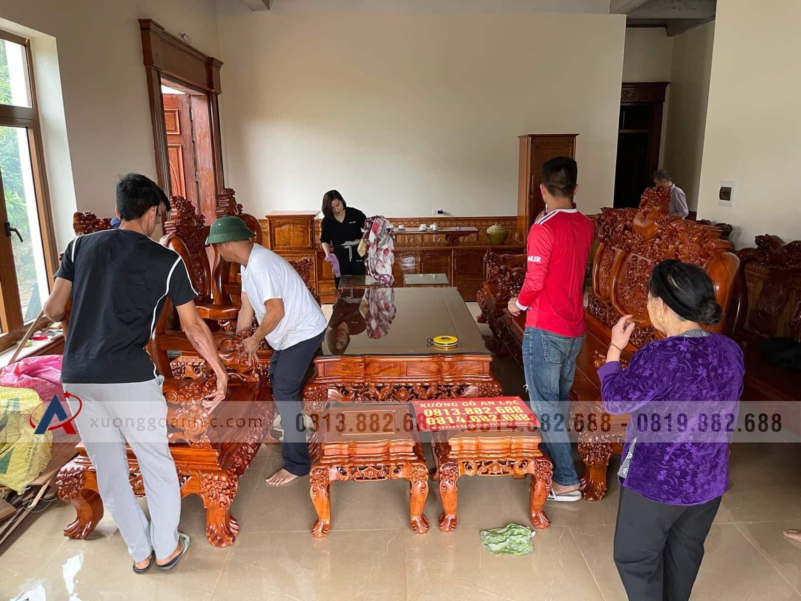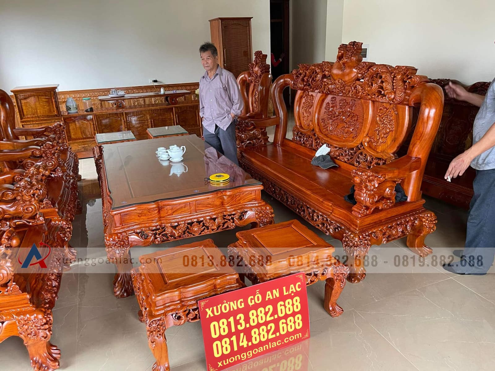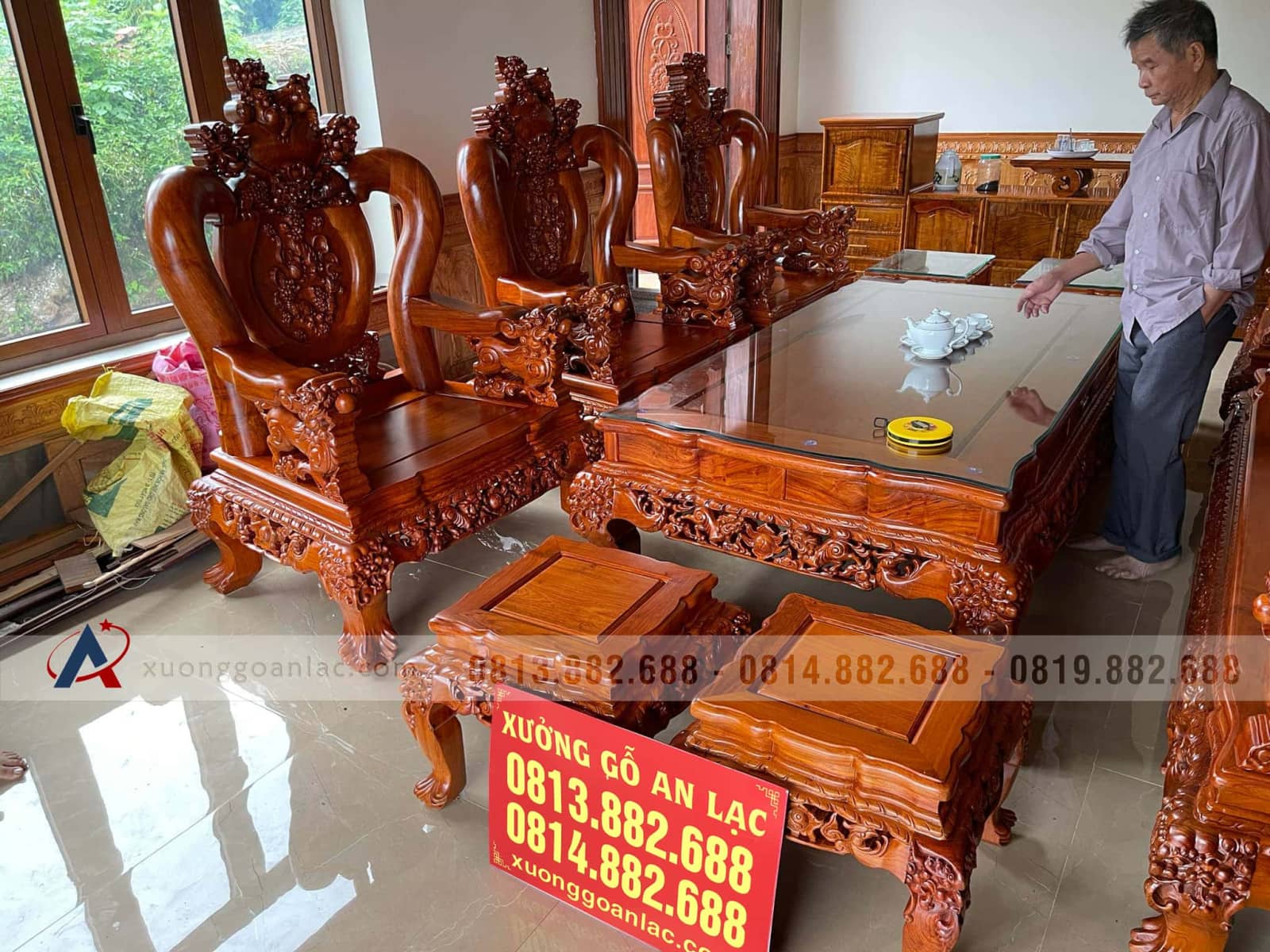 Chú Khôi muốn lựa chọn một bộ bàn ghế phong cách cổ điển Á Đông, thật khủng để phù hợp với phòng tiếp khách của gia đình. Chú đã nhờ kỹ thuật viên của xưởng tư vấn, rồi sau đó đã quyết định đặt Bộ bàn ghế Minh Nghê 3 đầu tay 14 gỗ hương đá 10 món kích thước vừa vặn với không gian phòng khách nhà mình.