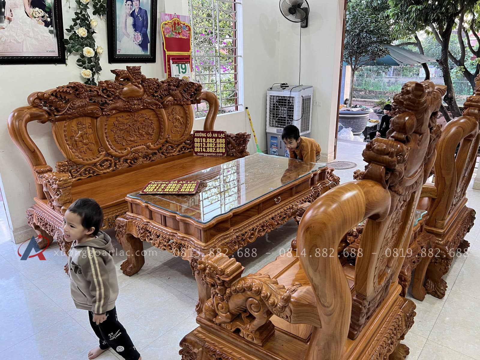 Bàn Giao Bộ Bàn Ghế Nghê Đỉnh 6 món gỗ gõ đỏ cao cấp cho gia đình anh Thụ ở Hà Nam. Bộ sản phẩm được xưởng gỗ An Lạc làm nguội kỹ, chọn gỗ làm cẩn thận nên có độ hoàn thiện rất cao.