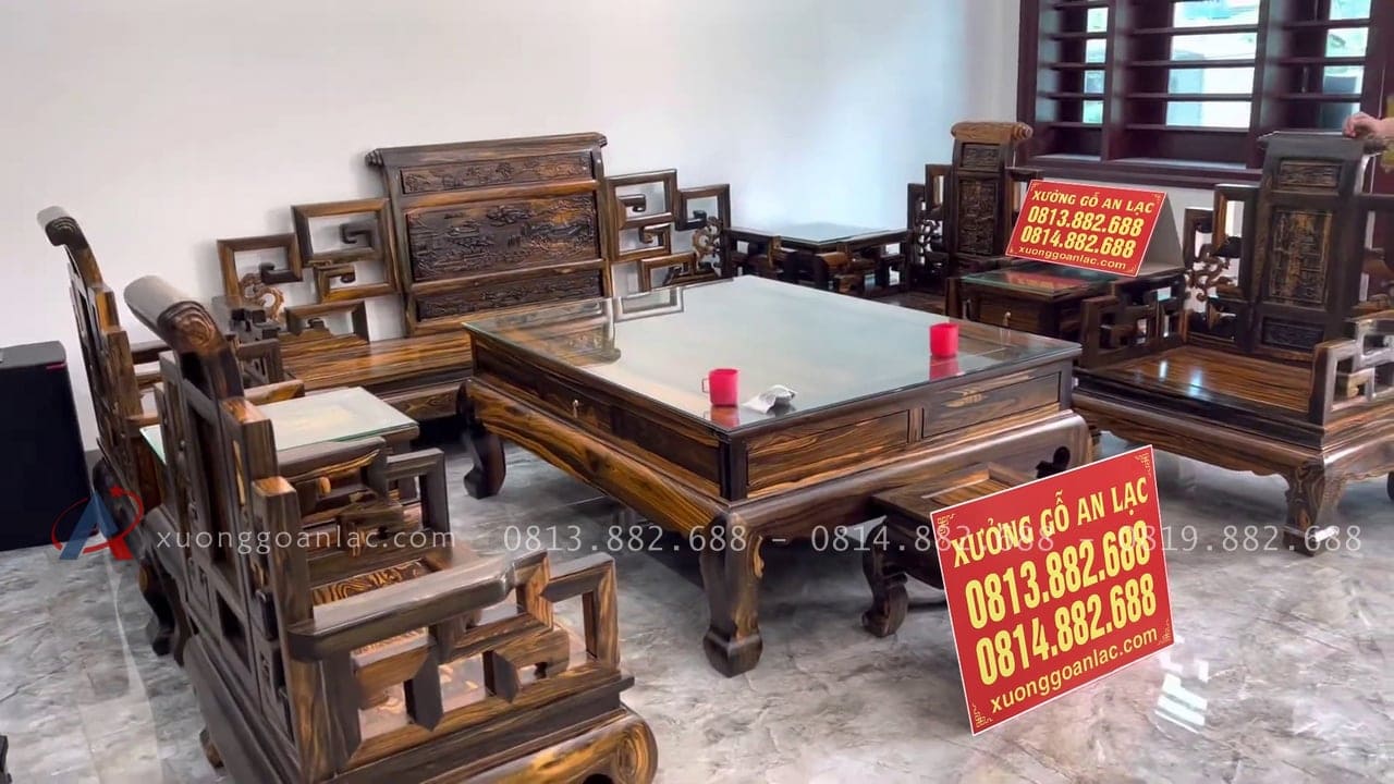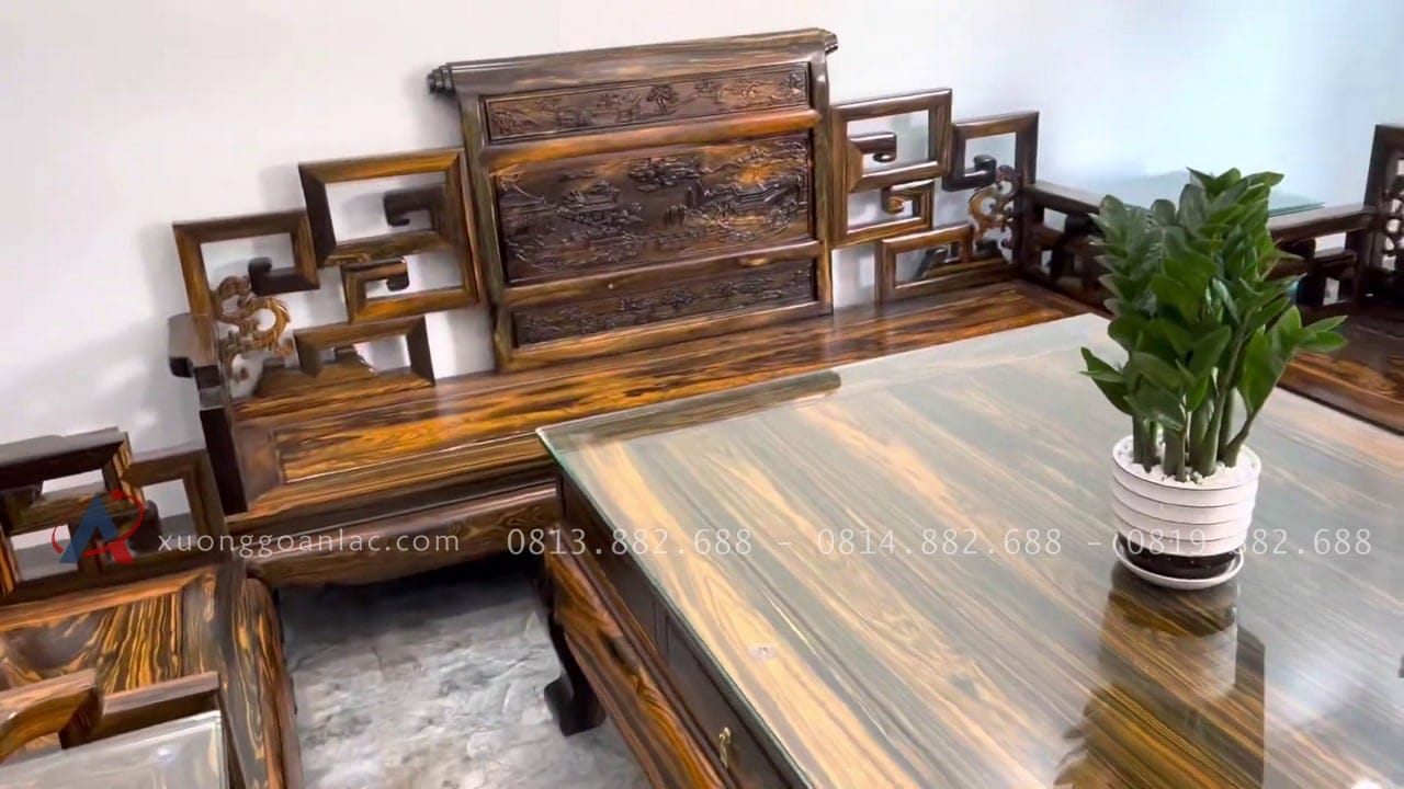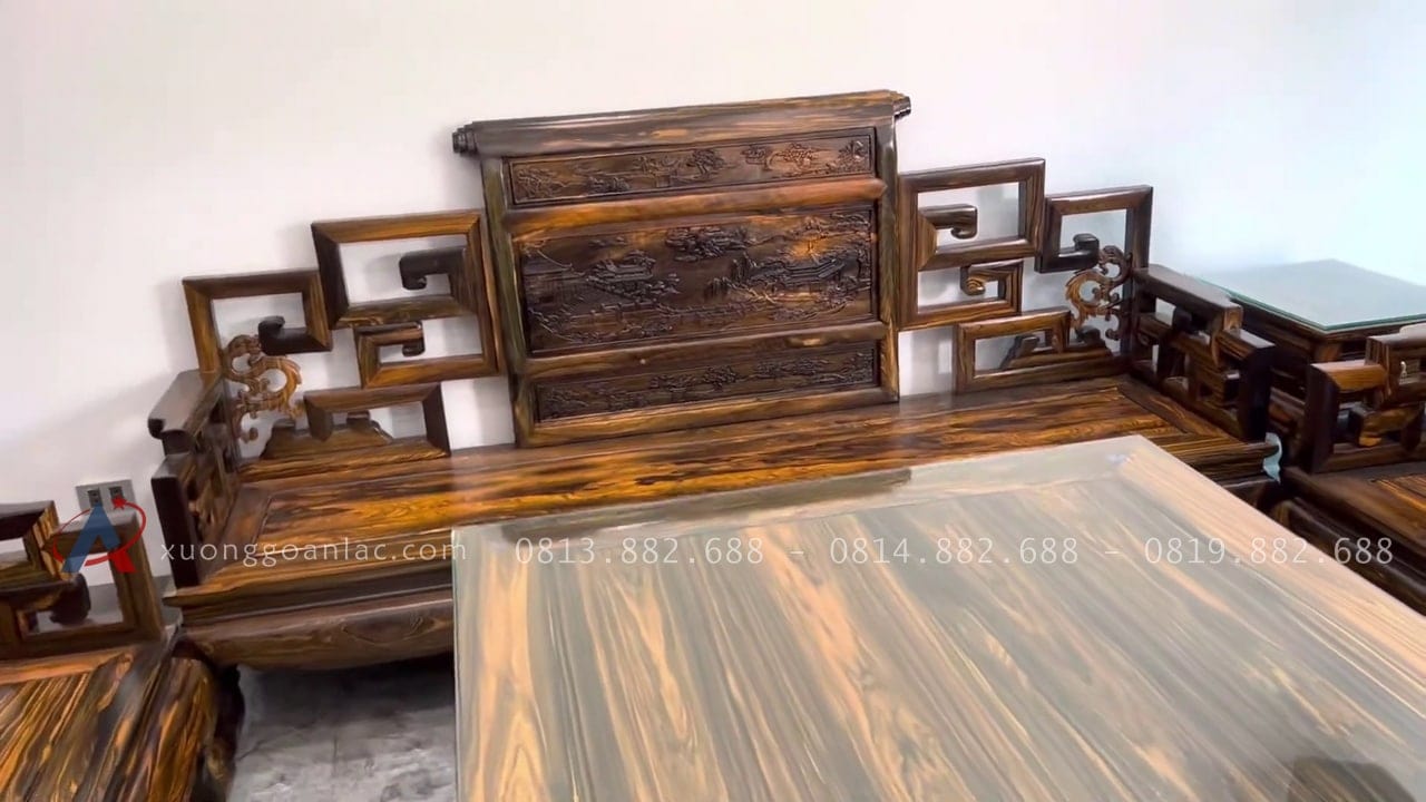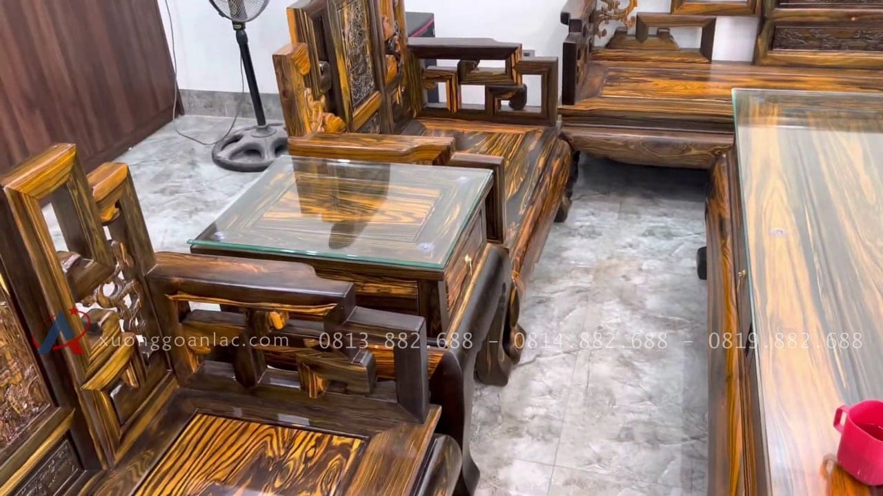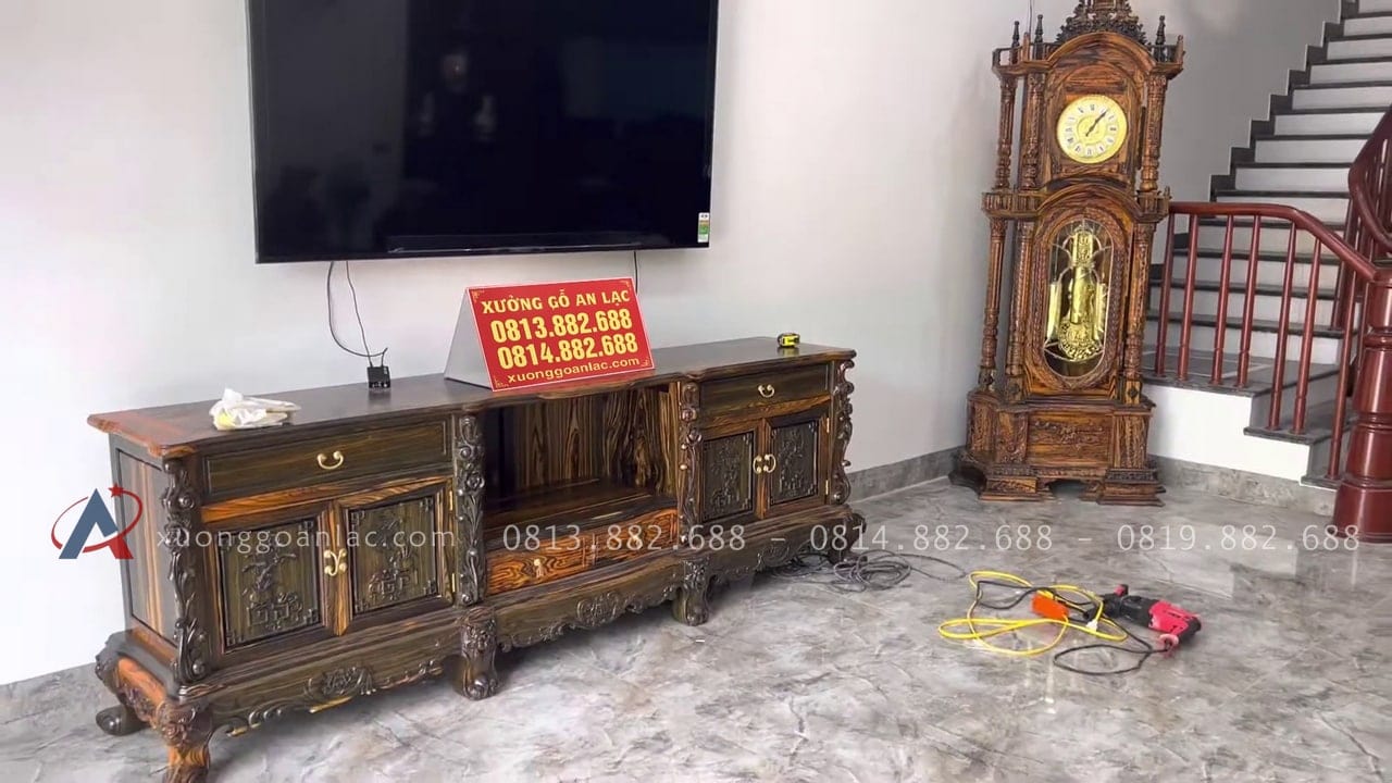[Bàn giao] Combo bàn ghế sơn thủy chân 12, kệ tivi, đồng hồ gỗ mun hoa Lào (Anh Quân - Bắc Ninh)