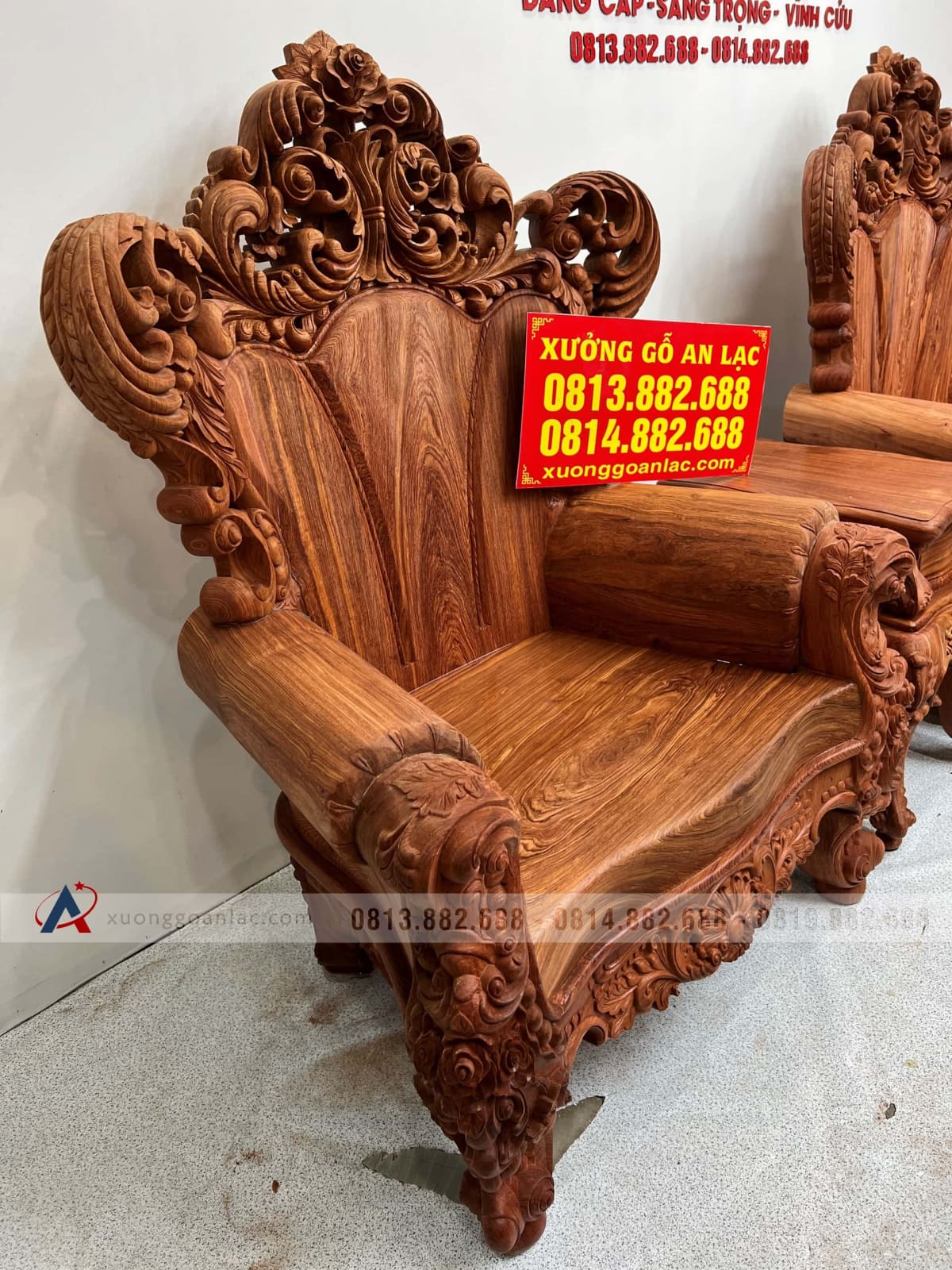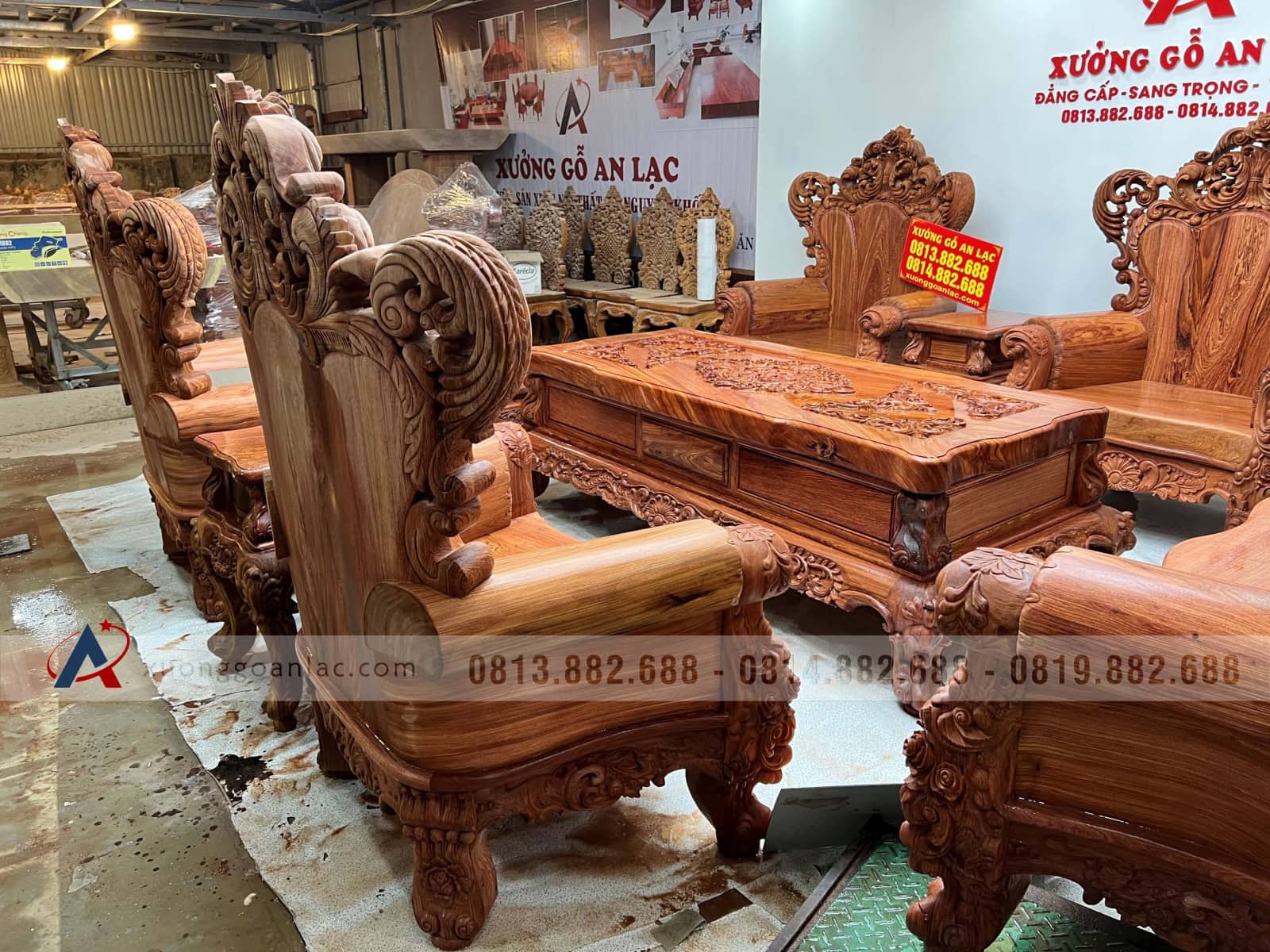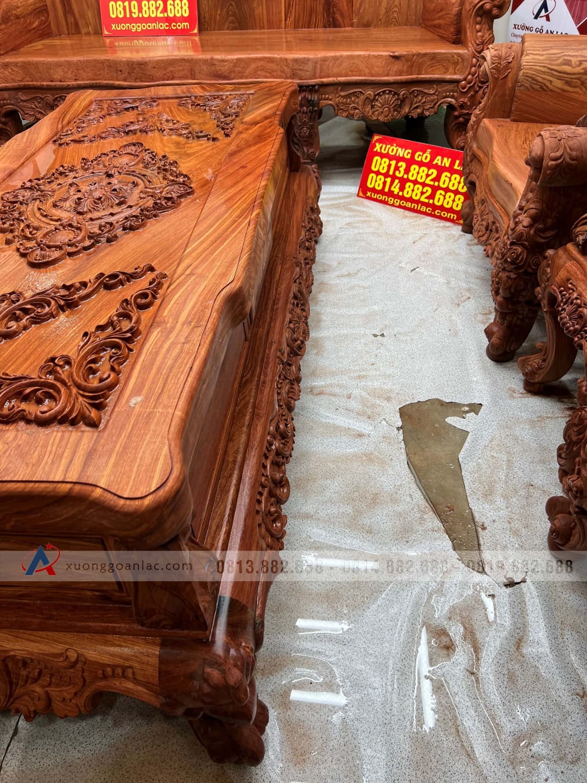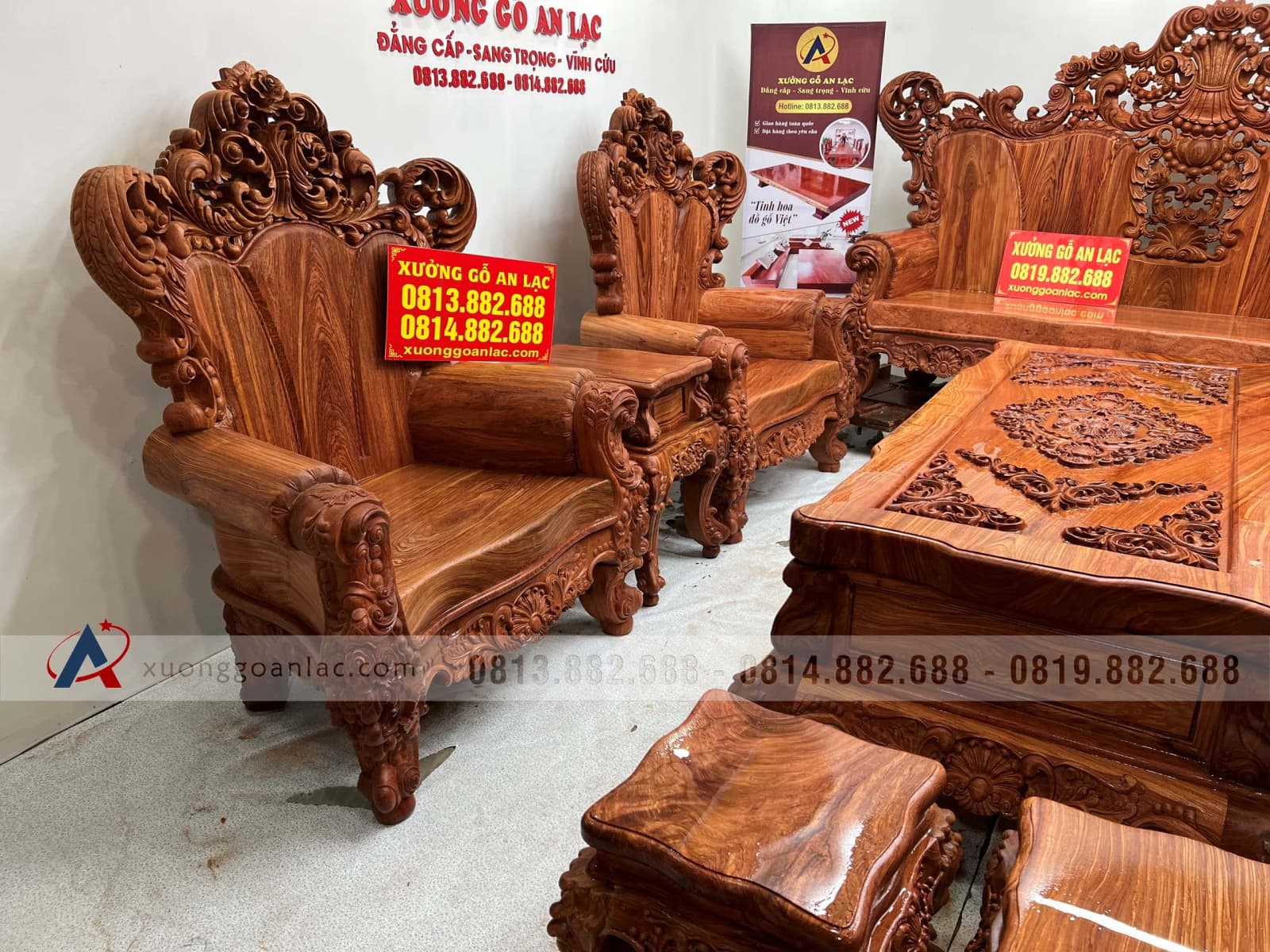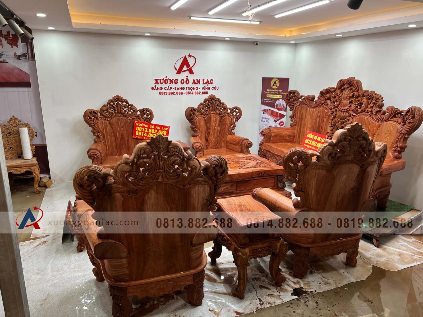 Hoàn thiện xong phần mộc bộ bàn ghế phòng khách mẫu Hoàng Gia Louis nguyên khối gỗ hương đá bộ 10 món cho bác Tư ở Kiên Giang. Bộ Hoàng gia của bác Tư là hàng tay đặc nguyên khối, chương liền tựa đặc nguyên khối dày 10cm, mặt bàn mặt ghế cũng là nguyên khối dày 10cm, thuộc phân khúc hàng cao cấp của xưởng gỗ An Lạc.