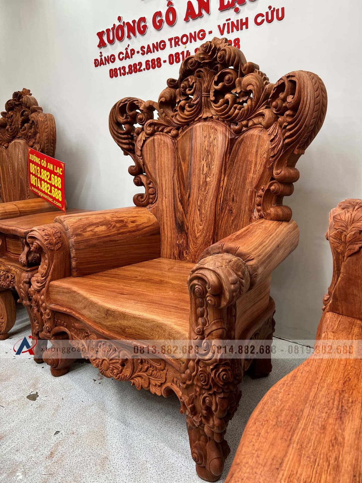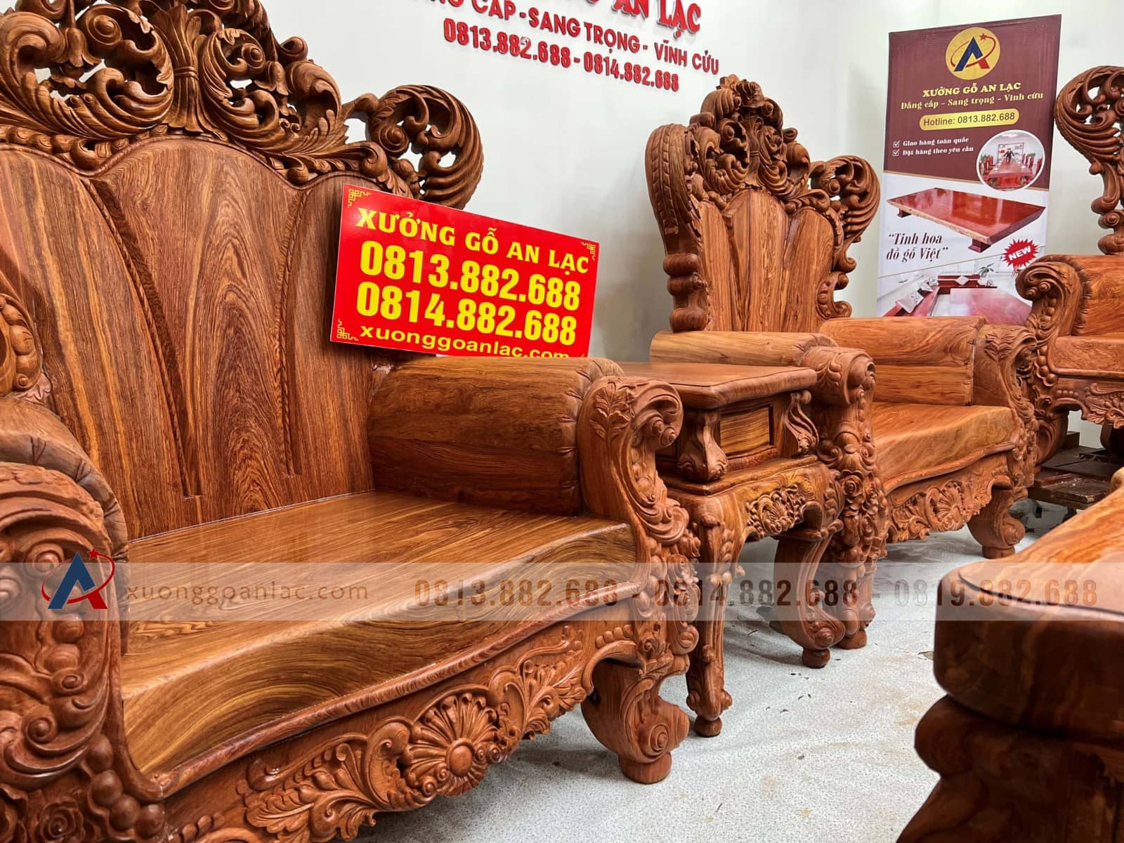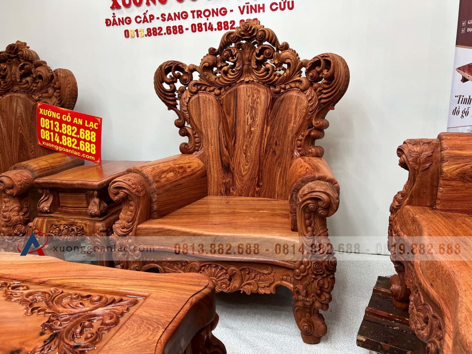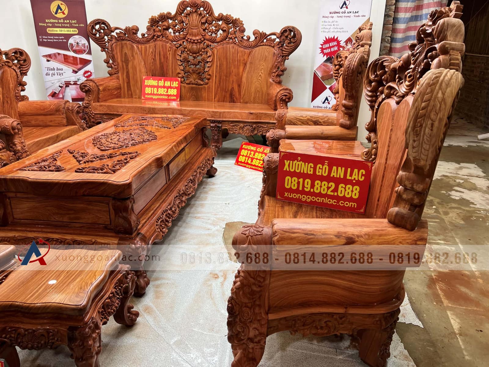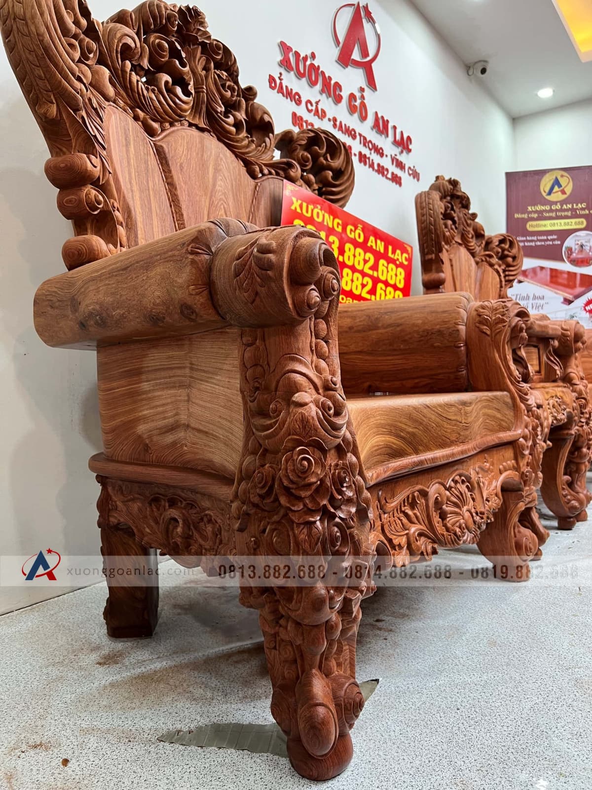 Hoàn thiện xong phần mộc bộ bàn ghế phòng khách mẫu Hoàng Gia Louis nguyên khối gỗ hương đá bộ 10 món cho bác Tư ở Kiên Giang. Bộ Hoàng gia của bác Tư là hàng tay đặc nguyên khối, chương liền tựa đặc nguyên khối dày 10cm, mặt bàn mặt ghế cũng là nguyên khối dày 10cm, thuộc phân khúc hàng cao cấp của xưởng gỗ An Lạc.