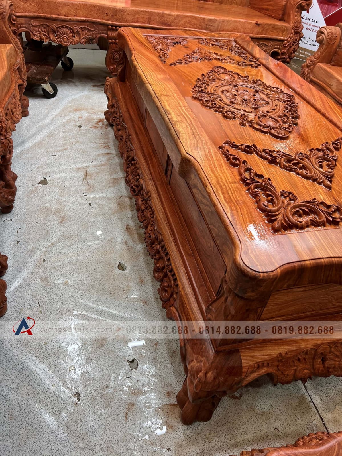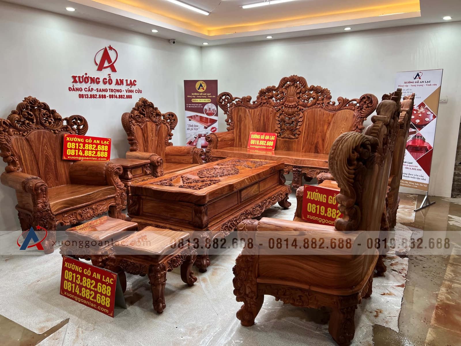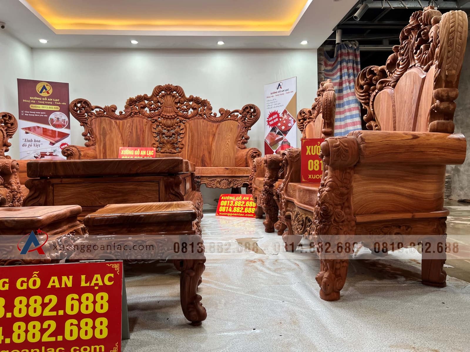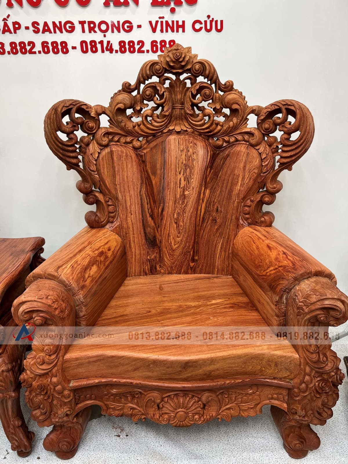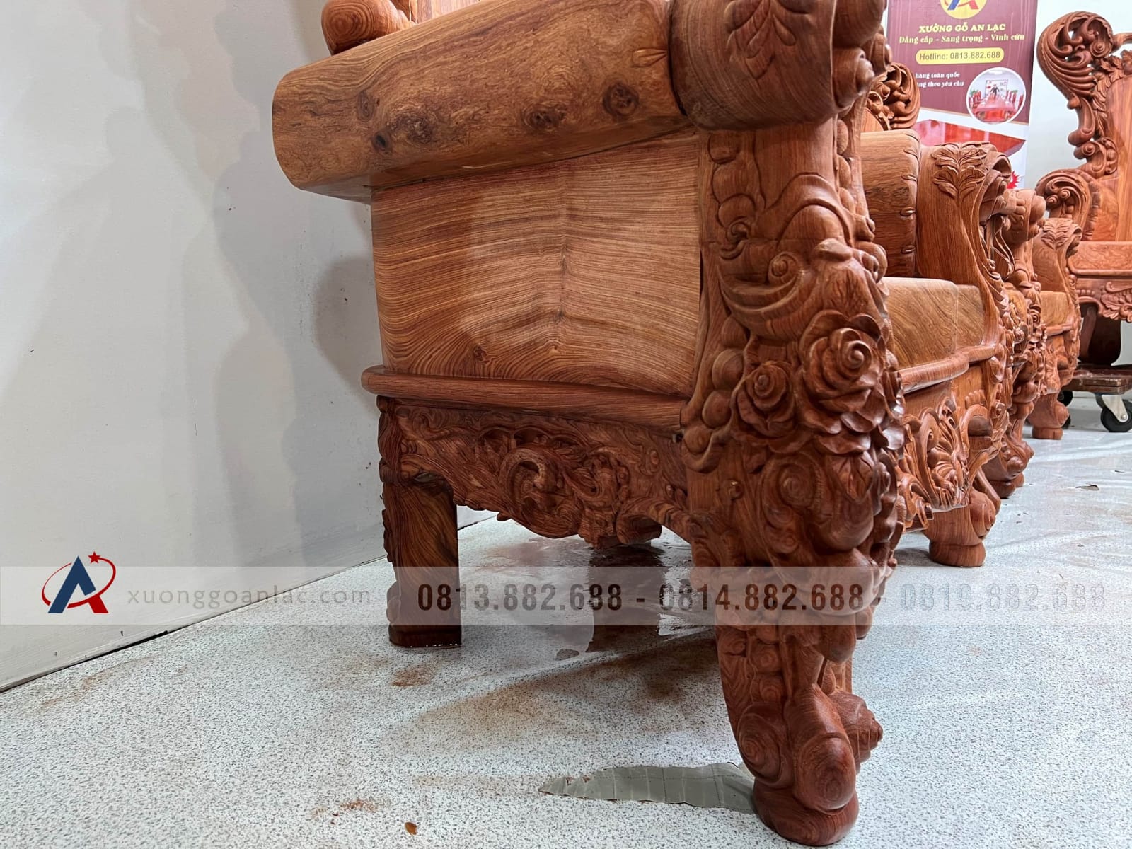 Hoàn thiện xong phần mộc bộ bàn ghế phòng khách mẫu Hoàng Gia Louis nguyên khối gỗ hương đá bộ 10 món cho bác Tư ở Kiên Giang. Bộ Hoàng gia của bác Tư là hàng tay đặc nguyên khối, chương liền tựa đặc nguyên khối dày 10cm, mặt bàn mặt ghế cũng là nguyên khối dày 10cm, thuộc phân khúc hàng cao cấp của xưởng gỗ An Lạc.