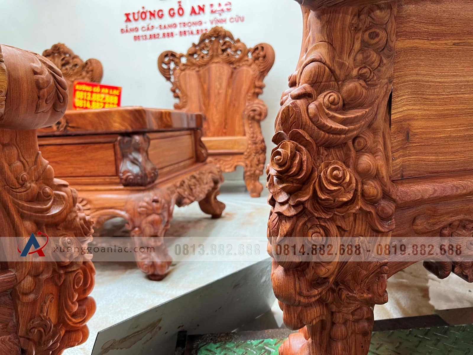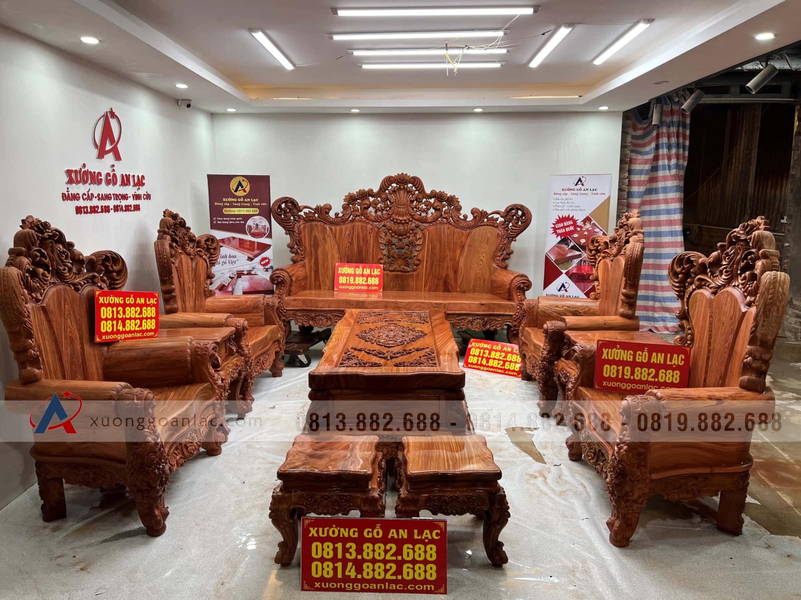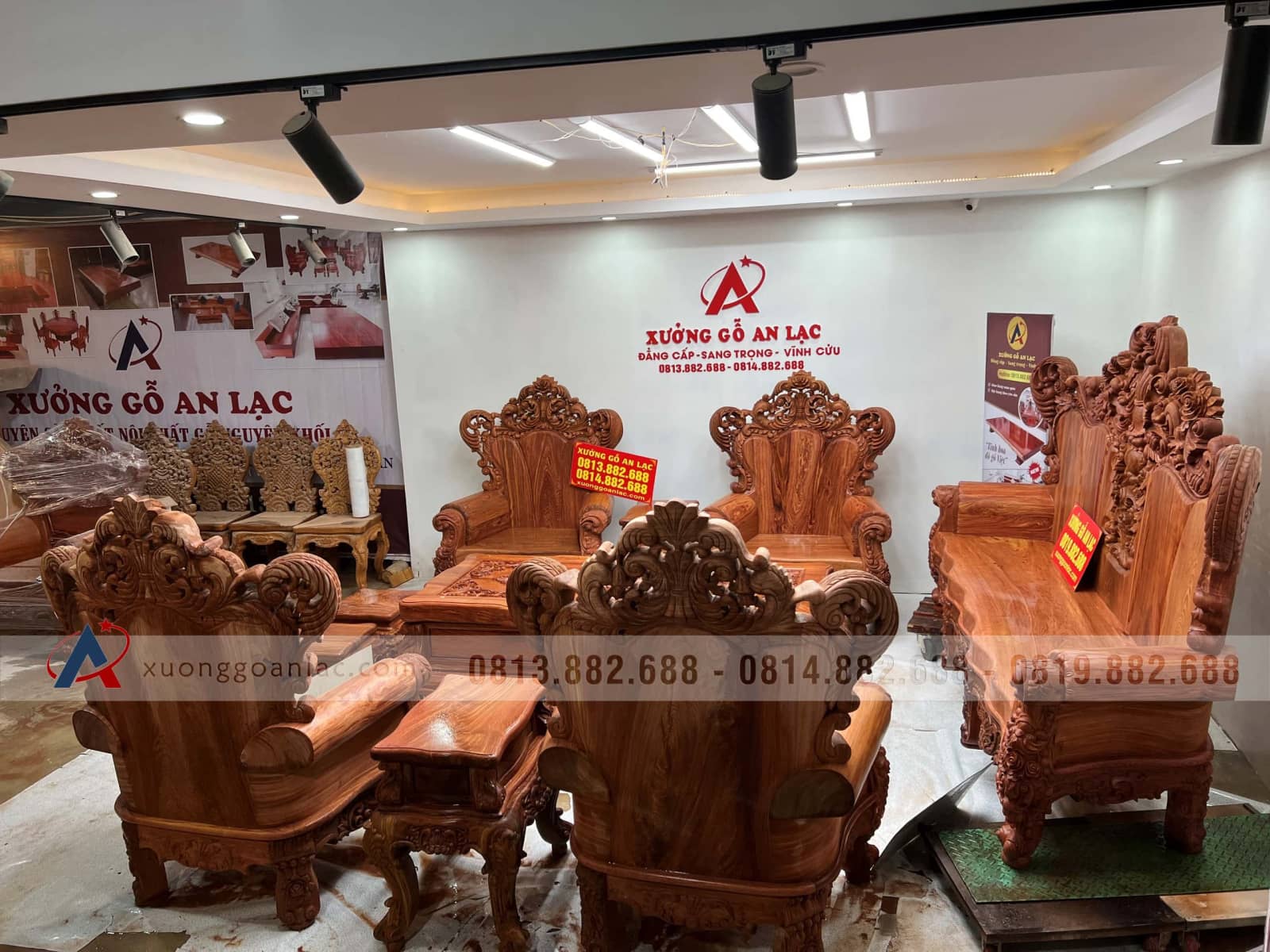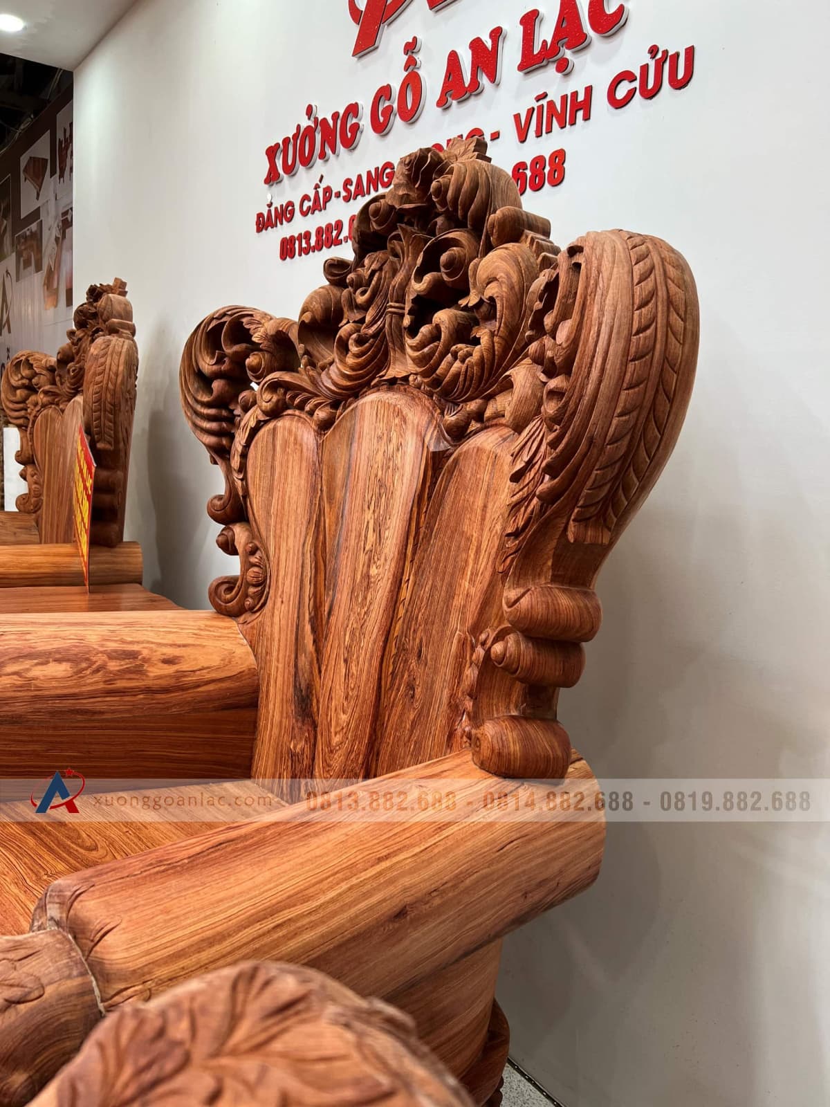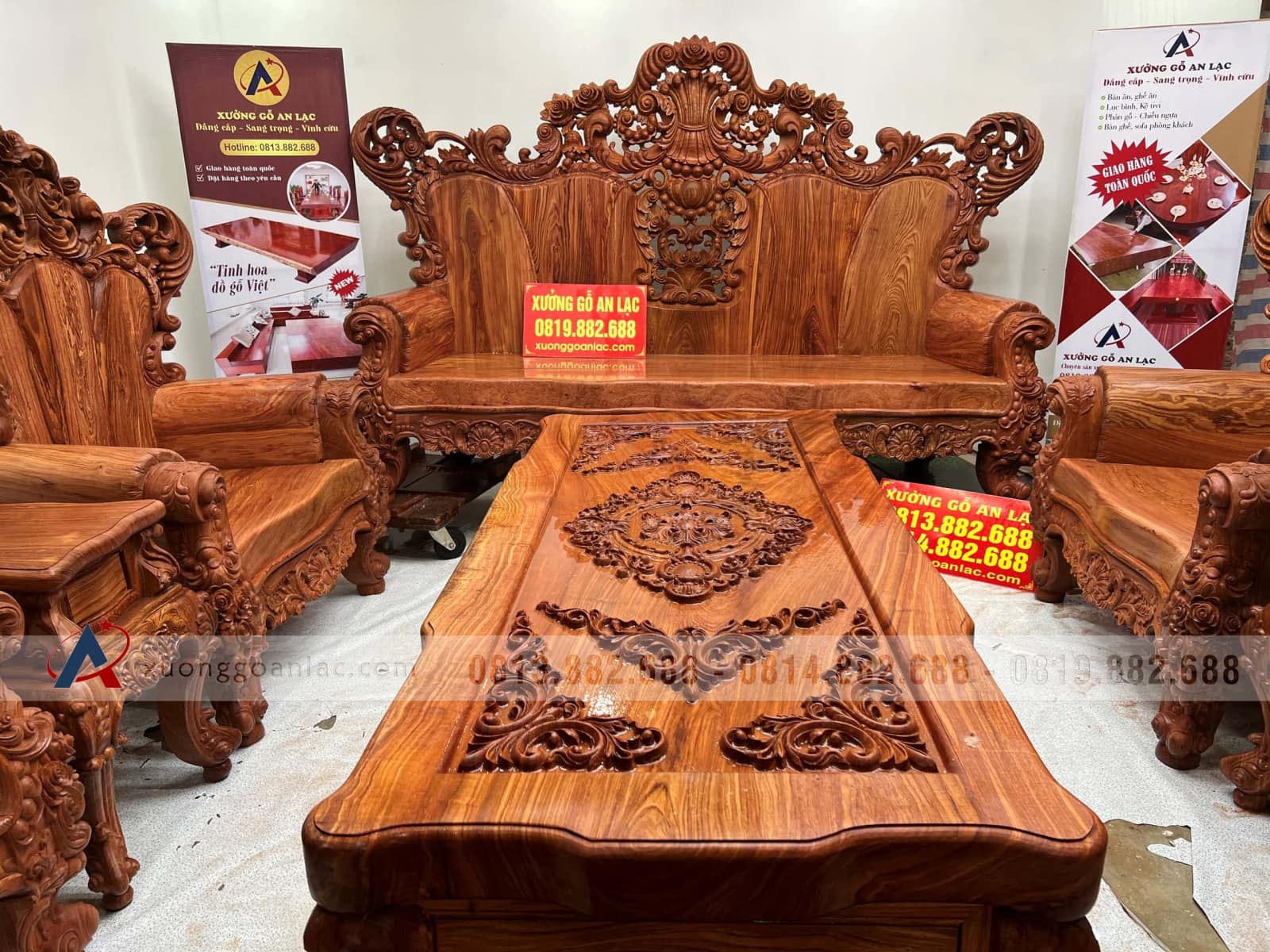 Hoàn thiện xong phần mộc bộ bàn ghế phòng khách mẫu Hoàng Gia Louis nguyên khối gỗ hương đá bộ 10 món cho bác Tư ở Kiên Giang. Bộ Hoàng gia của bác Tư là hàng tay đặc nguyên khối, chương liền tựa đặc nguyên khối dày 10cm, mặt bàn mặt ghế cũng là nguyên khối dày 10cm, thuộc phân khúc hàng cao cấp của xưởng gỗ An Lạc.