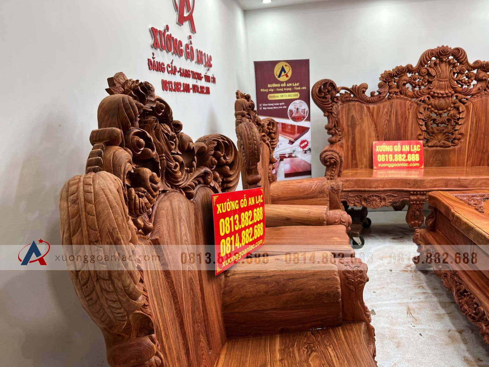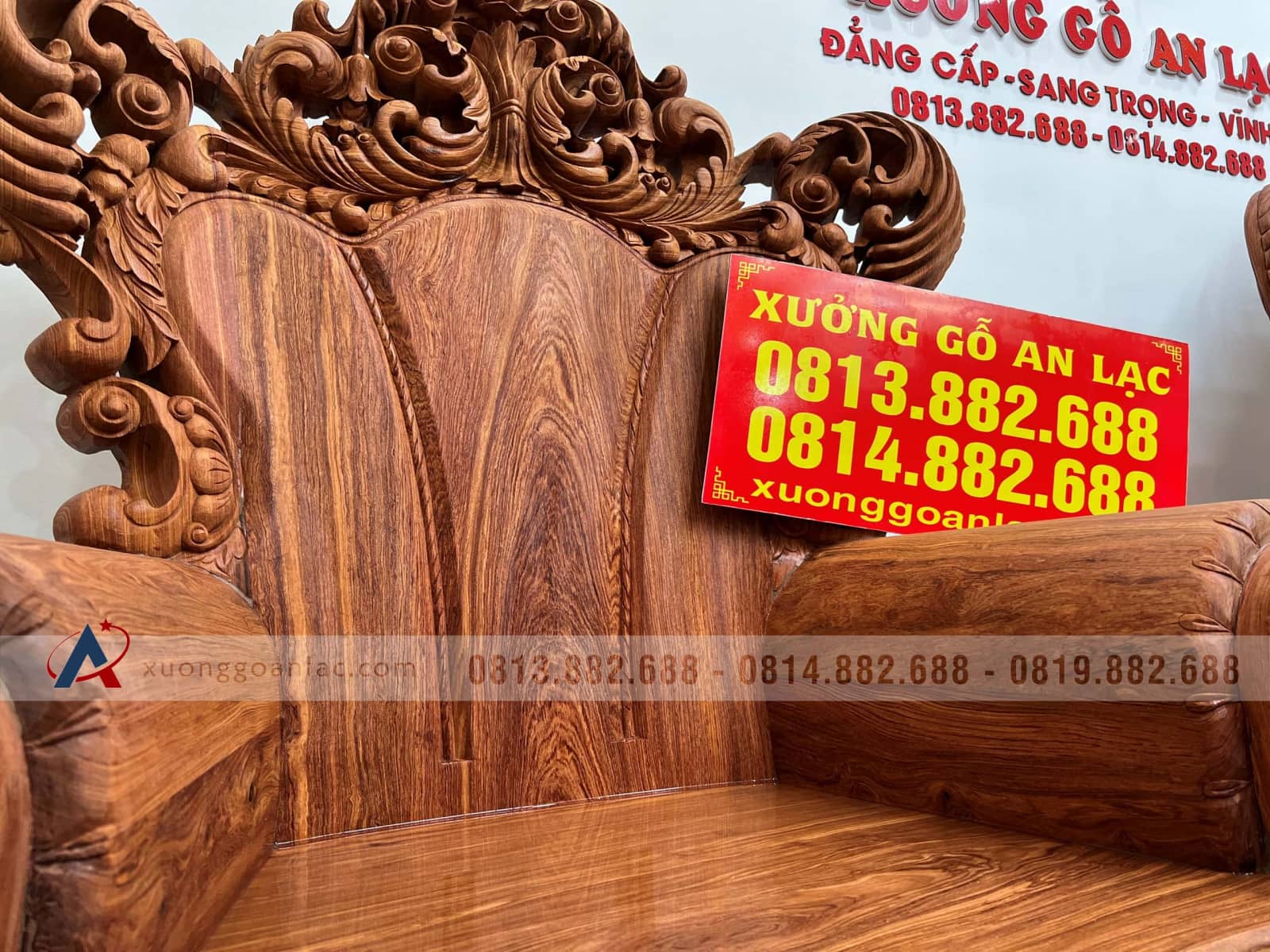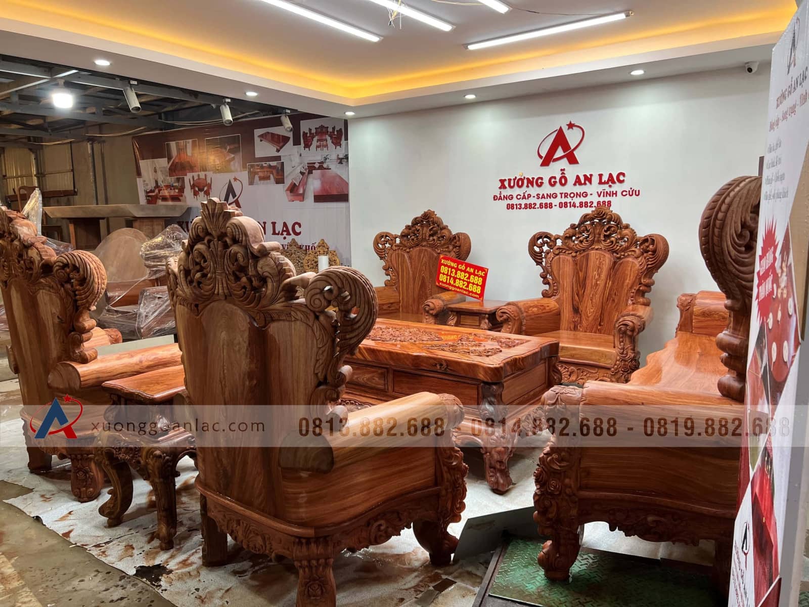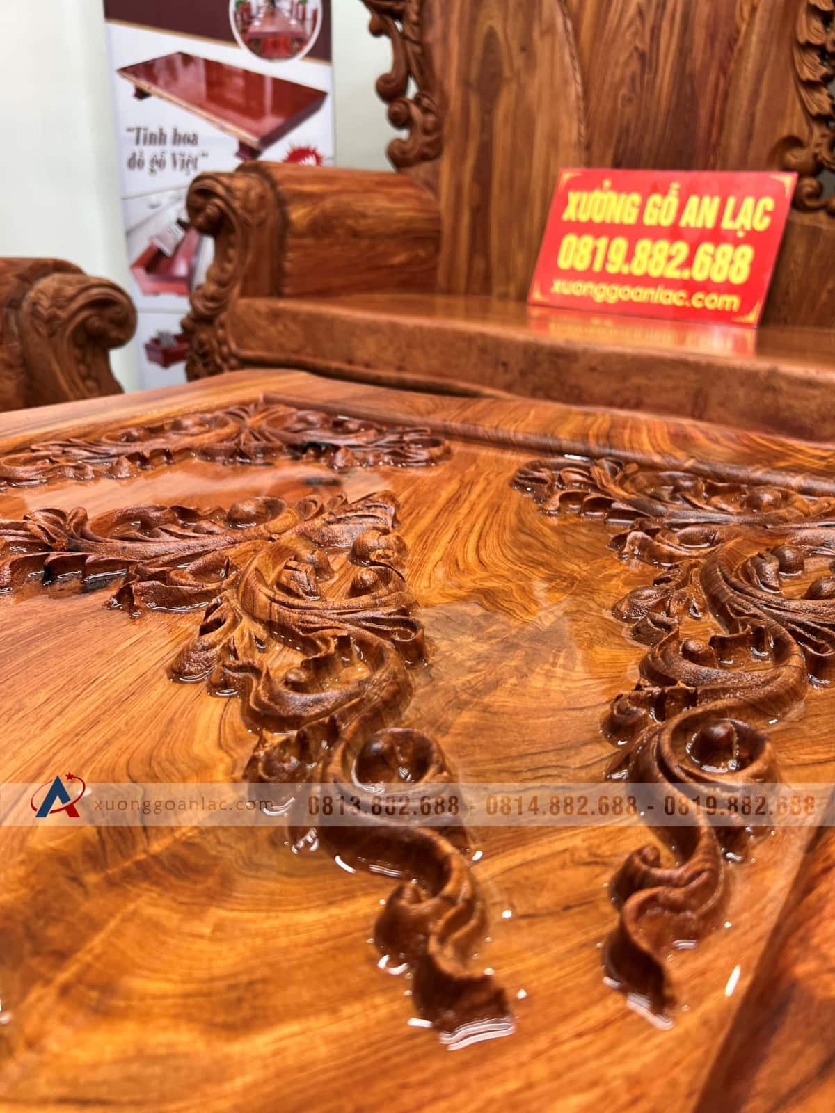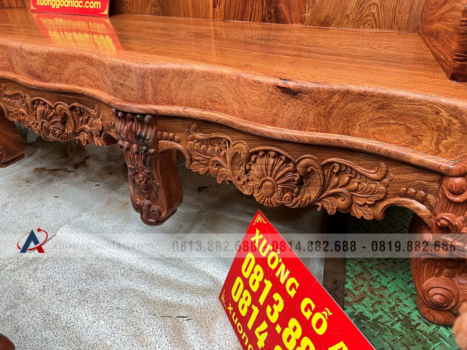 Hoàn thiện xong phần mộc bộ bàn ghế phòng khách mẫu Hoàng Gia Louis nguyên khối gỗ hương đá bộ 10 món cho bác Tư ở Kiên Giang. Bộ Hoàng gia của bác Tư là hàng tay đặc nguyên khối, chương liền tựa đặc nguyên khối dày 10cm, mặt bàn mặt ghế cũng là nguyên khối dày 10cm, thuộc phân khúc hàng cao cấp của xưởng gỗ An Lạc.