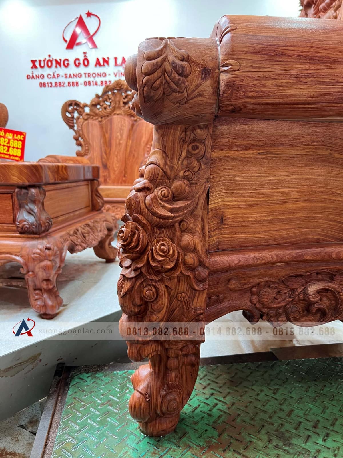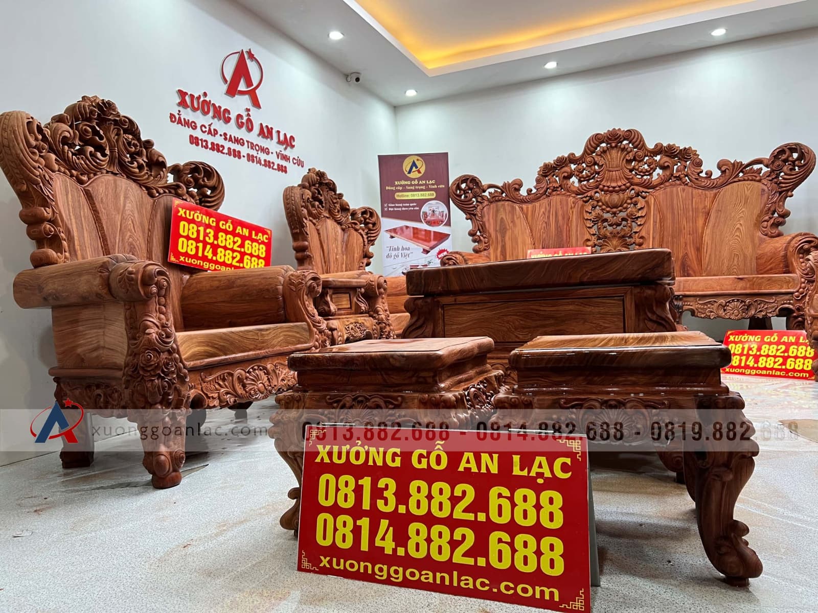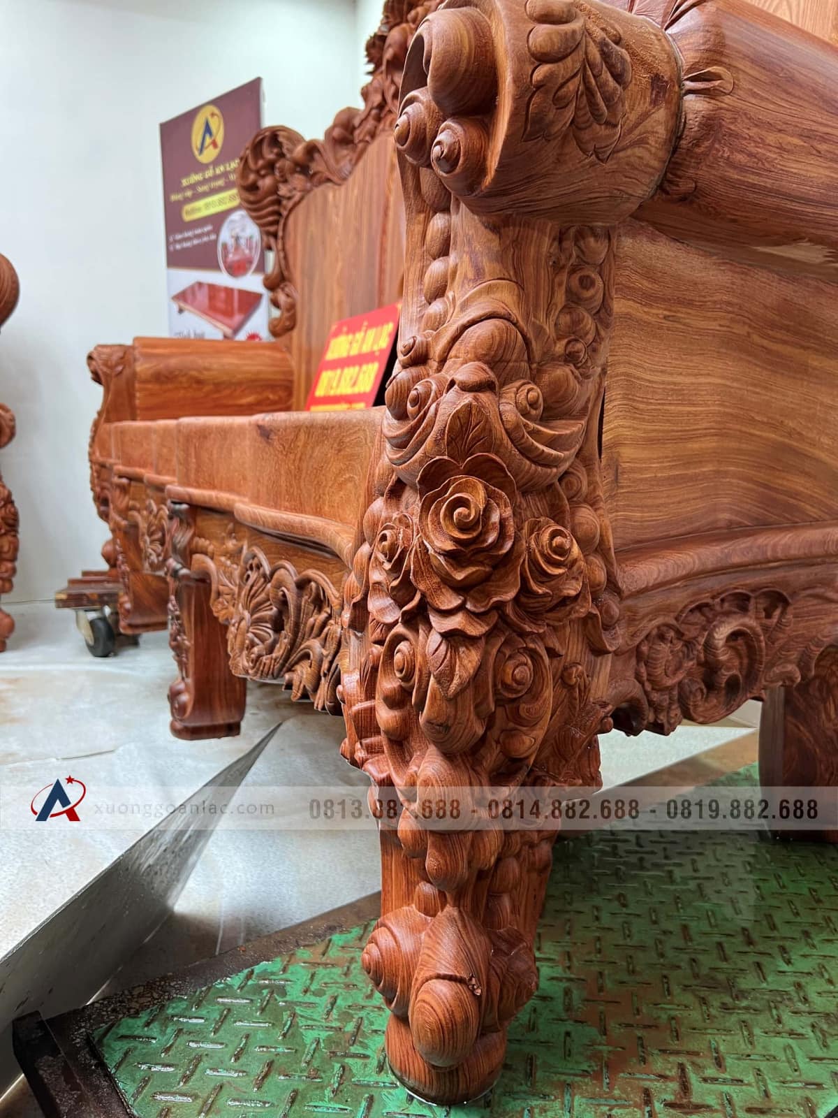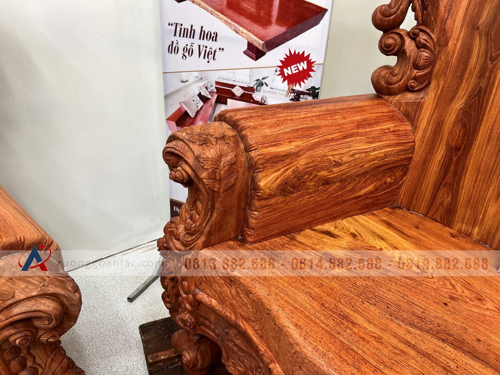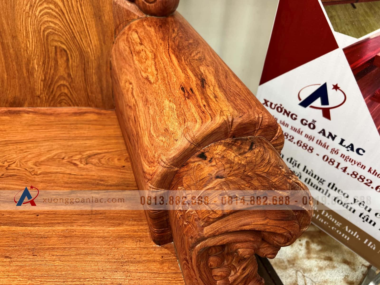 Hoàn thiện xong phần mộc bộ bàn ghế phòng khách mẫu Hoàng Gia Louis nguyên khối gỗ hương đá bộ 10 món cho bác Tư ở Kiên Giang. Bộ Hoàng gia của bác Tư là hàng tay đặc nguyên khối, chương liền tựa đặc nguyên khối dày 10cm, mặt bàn mặt ghế cũng là nguyên khối dày 10cm, thuộc phân khúc hàng cao cấp của xưởng gỗ An Lạc.