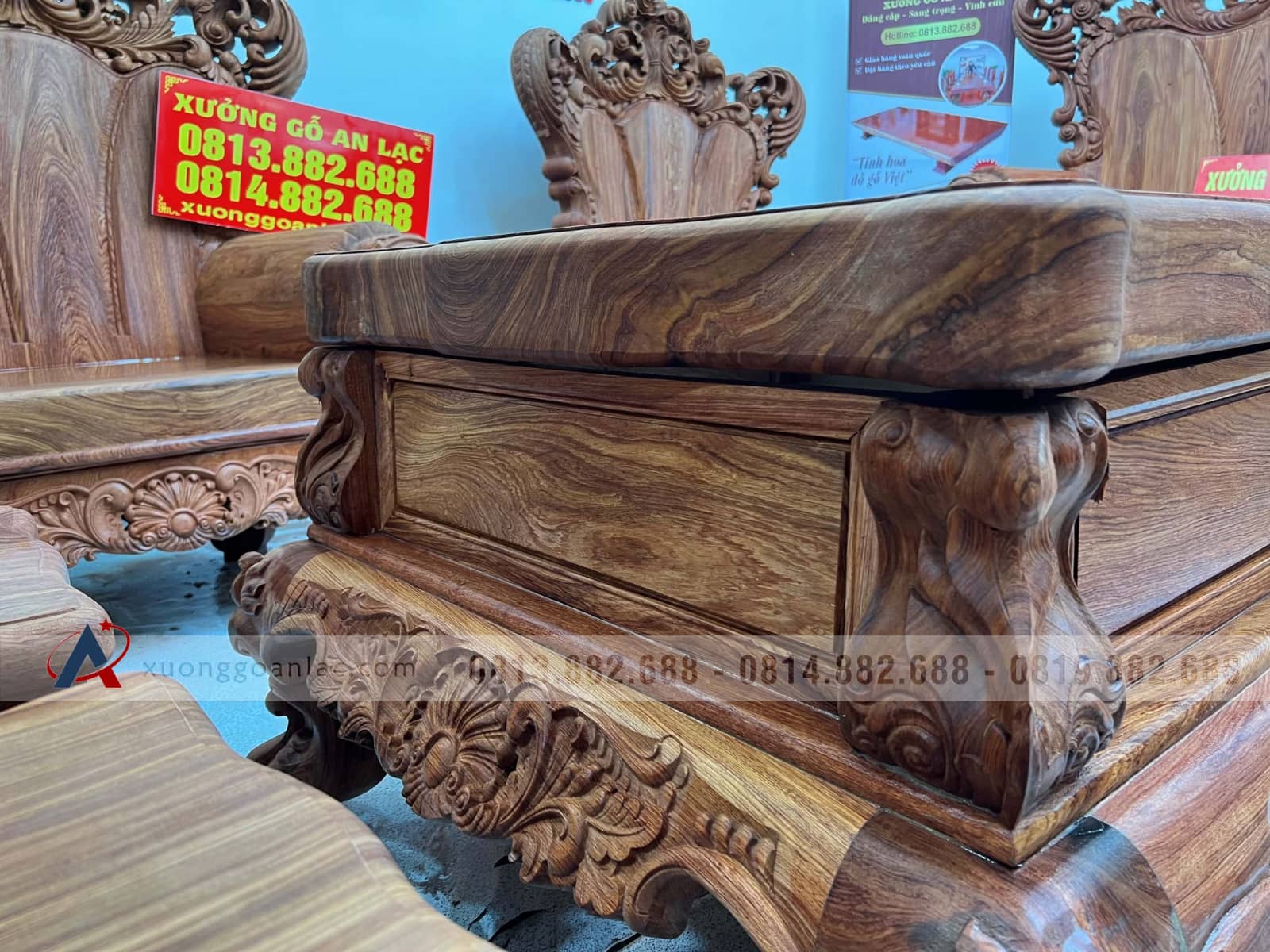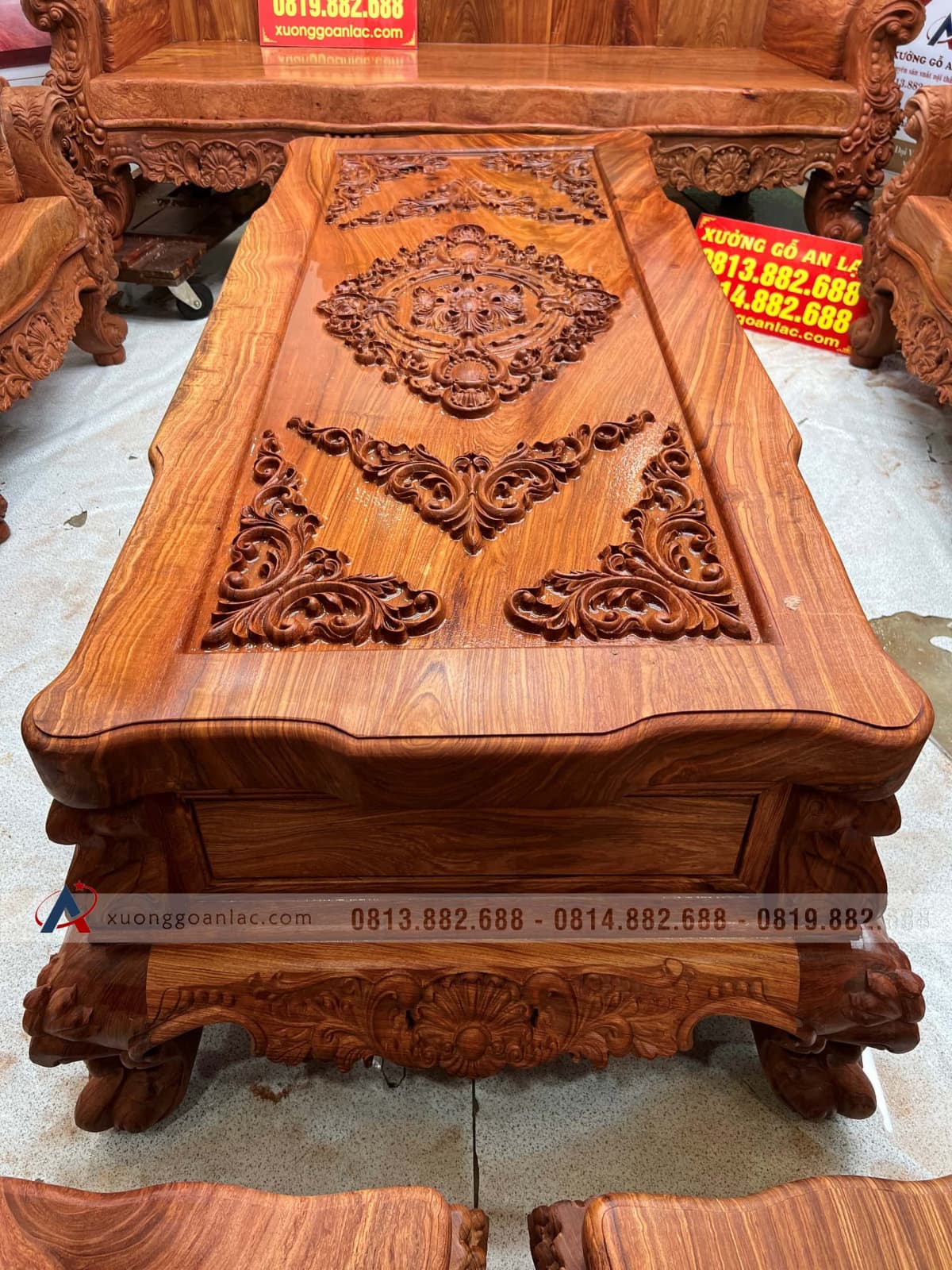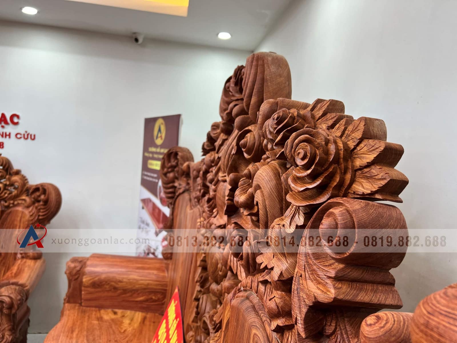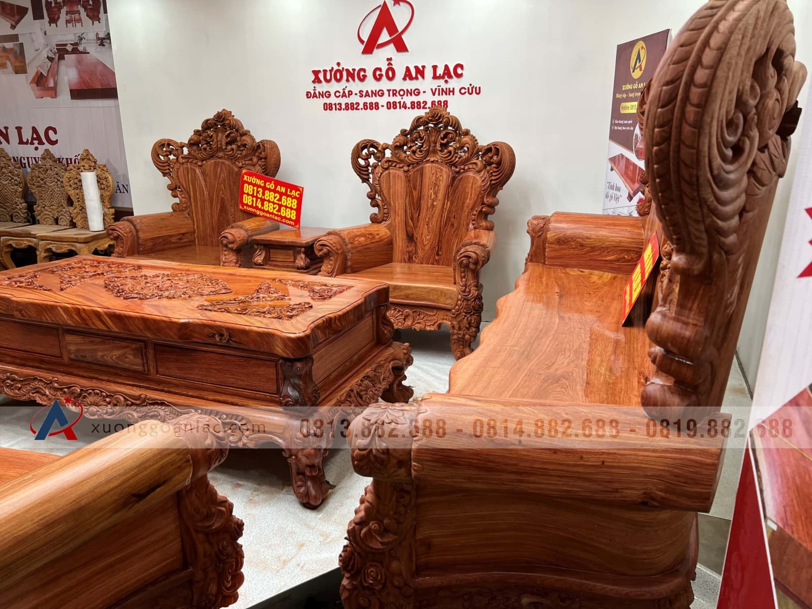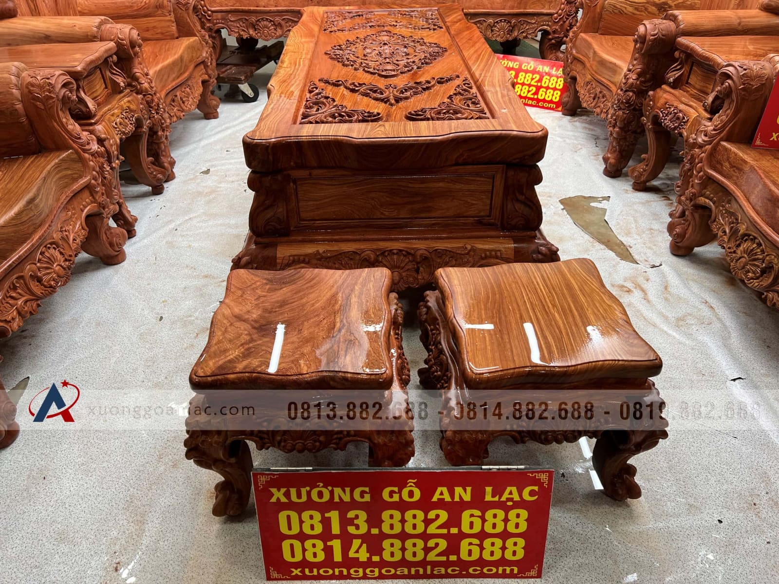 Hoàn thiện xong phần mộc bộ bàn ghế phòng khách mẫu Hoàng Gia Louis nguyên khối gỗ hương đá bộ 10 món cho bác Tư ở Kiên Giang. Bộ Hoàng gia của bác Tư là hàng tay đặc nguyên khối, chương liền tựa đặc nguyên khối dày 10cm, mặt bàn mặt ghế cũng là nguyên khối dày 10cm, thuộc phân khúc hàng cao cấp của xưởng gỗ An Lạc.