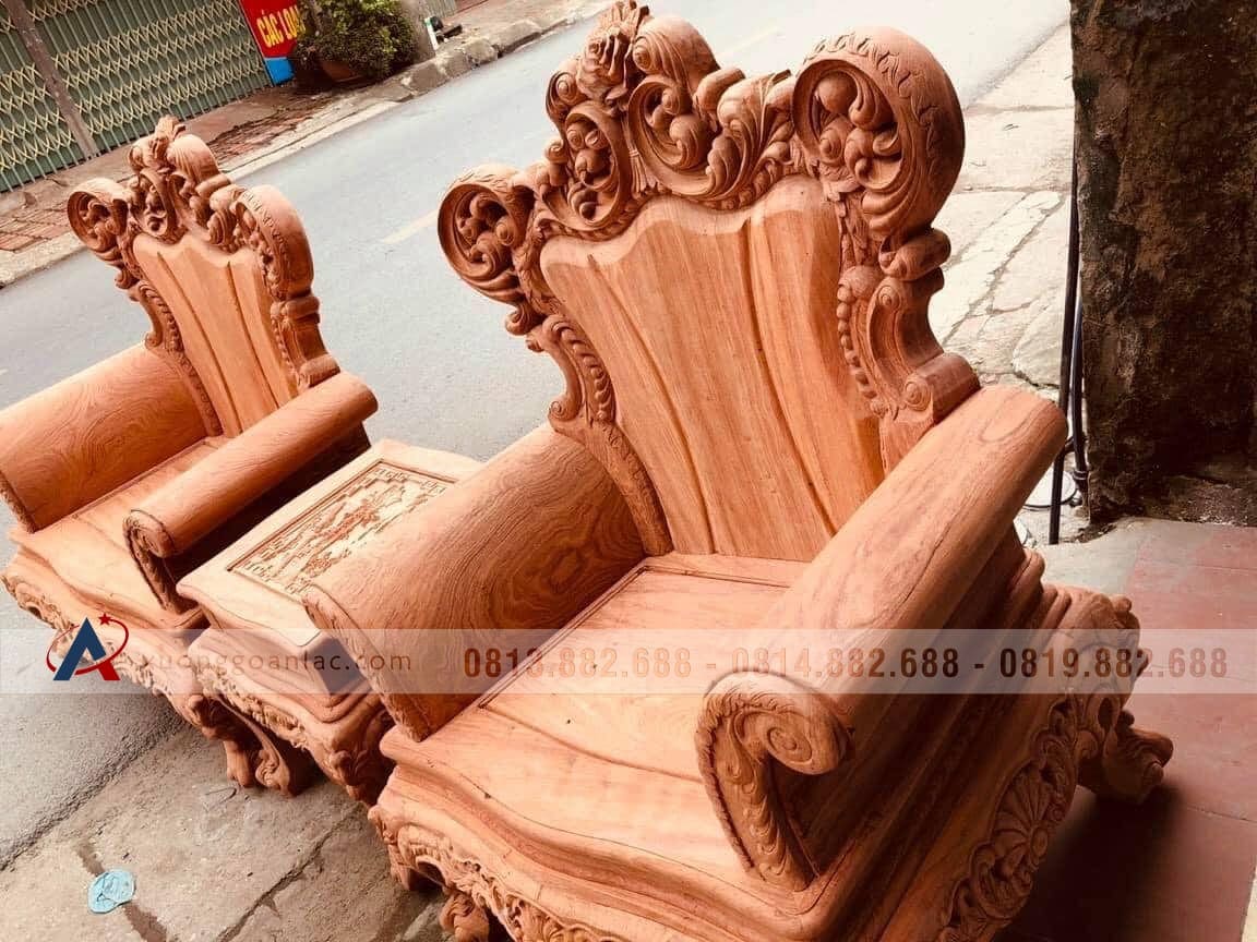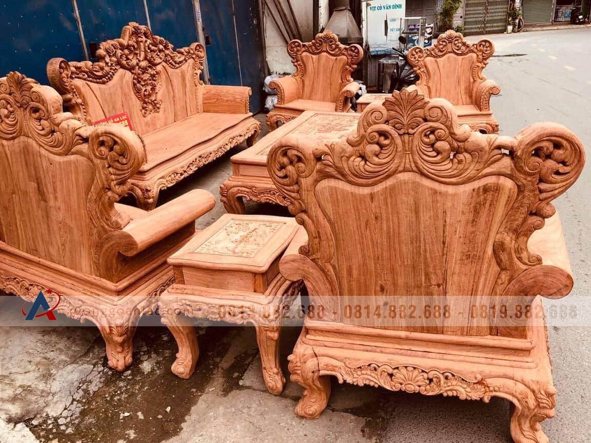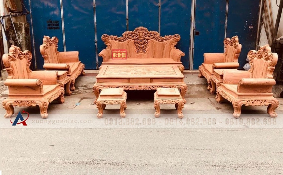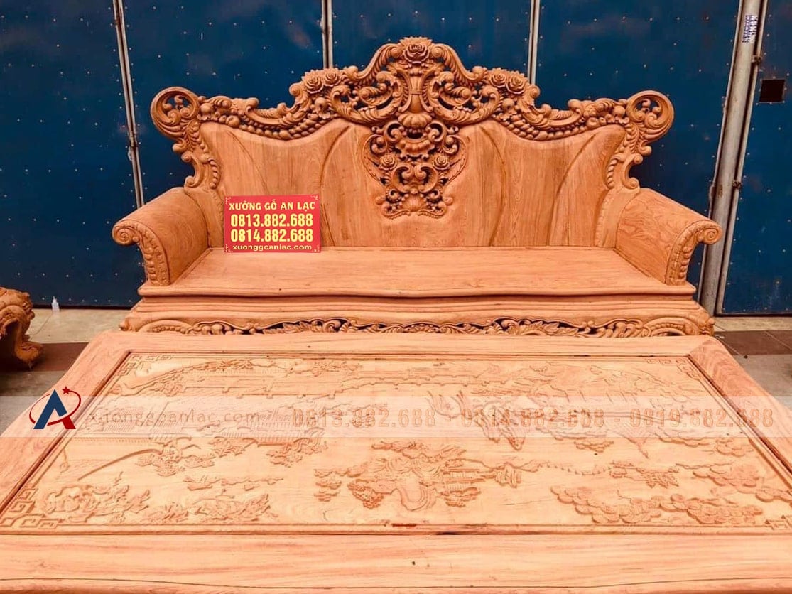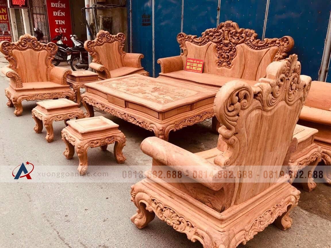 Hoàn thiện xong phần mộc bộ bàn ghế phòng khách mẫu Hoàng Gia Louis nguyên khối gỗ hương đá chân 14 bộ 10 món cho anh Hải ở Hưng Yên. Bộ Hoàng gia của anh Hải là hàng tay đặc nguyên khối, chương liền tựa đặc nguyên khối dày 10cm, khuôn tranh 4cm, ván 2cm; thuộc phân khúc hàng cao cấp của xưởng gỗ An Lạc.