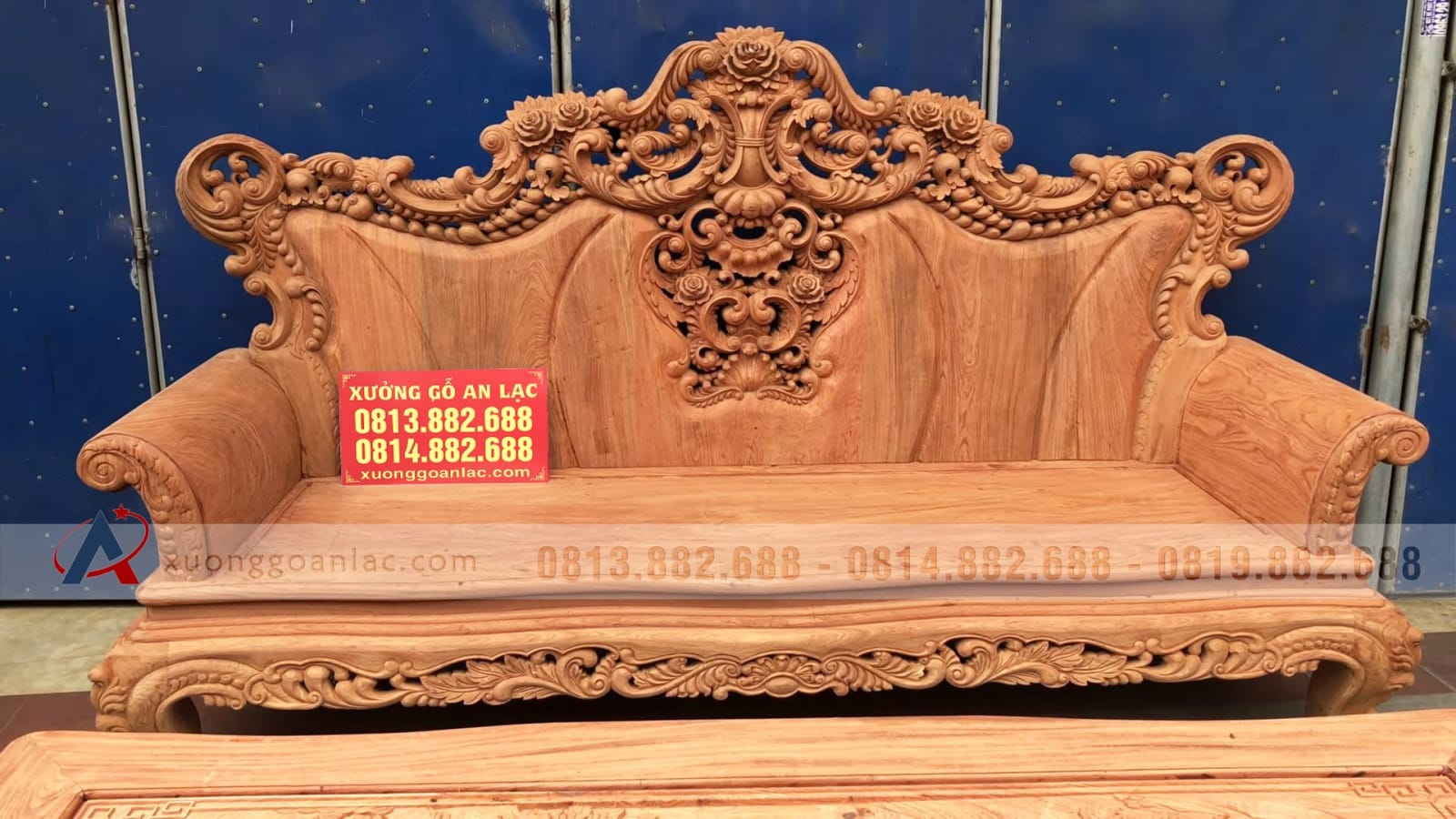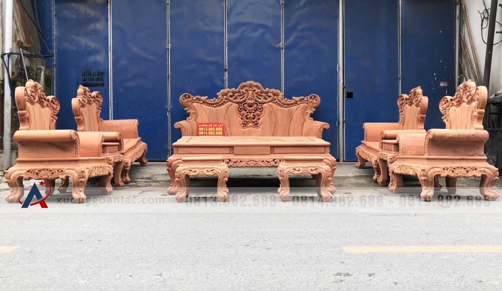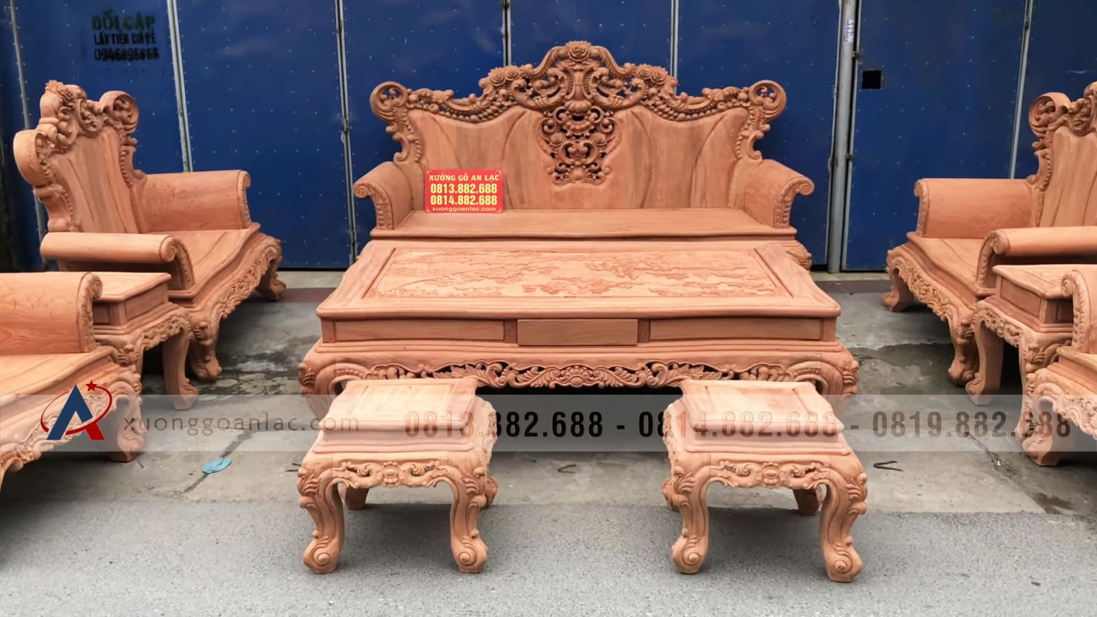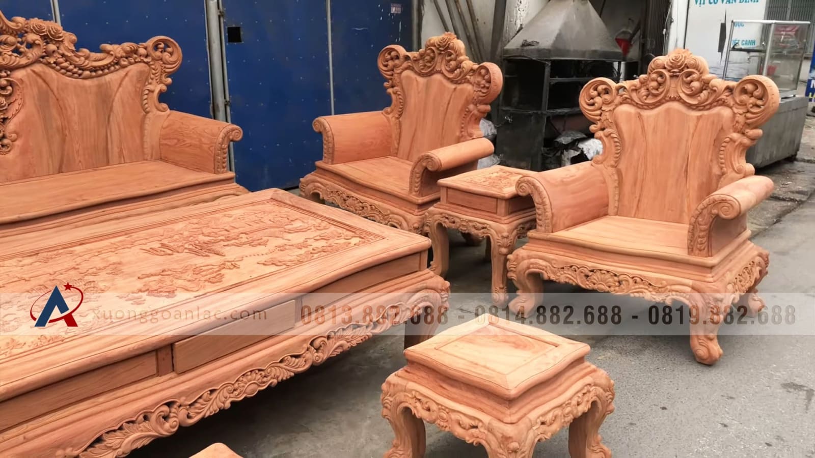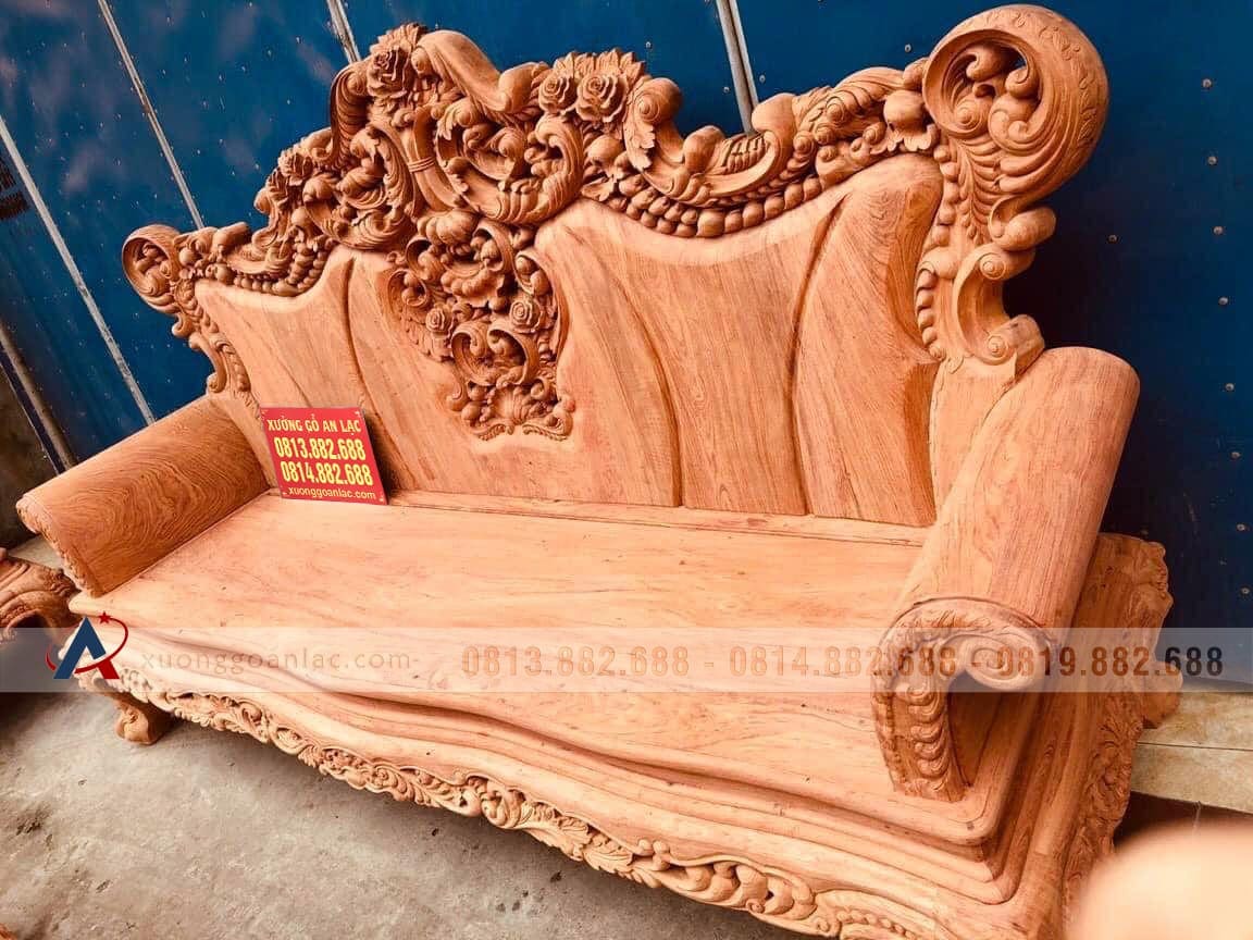 Hoàn thiện xong phần mộc bộ bàn ghế phòng khách mẫu Hoàng Gia Louis nguyên khối gỗ hương đá chân 14 bộ 10 món cho anh Hải ở Hưng Yên. Bộ Hoàng gia của anh Hải là hàng tay đặc nguyên khối, chương liền tựa đặc nguyên khối dày 10cm, khuôn tranh 4cm, ván 2cm; thuộc phân khúc hàng cao cấp của xưởng gỗ An Lạc.