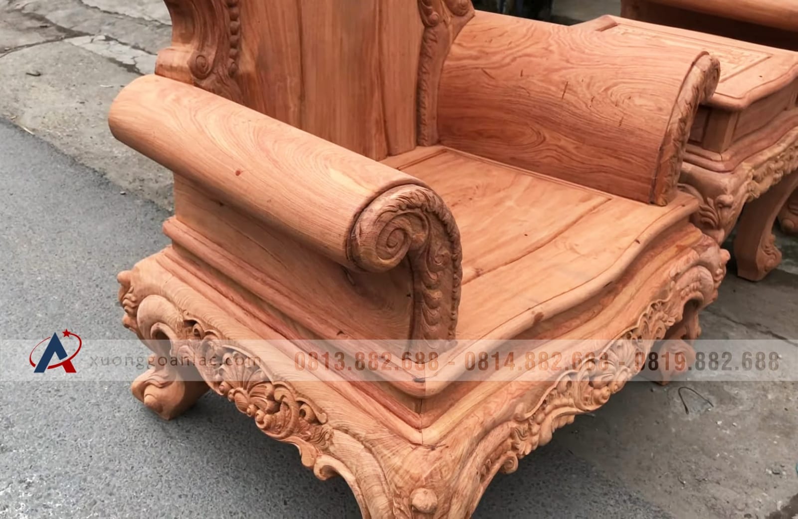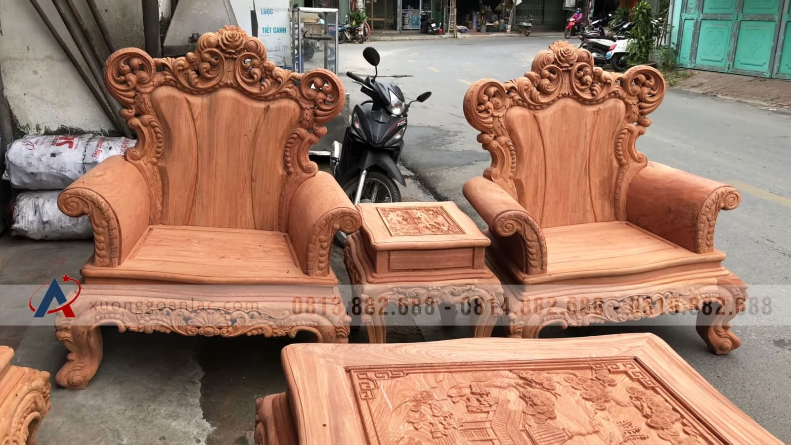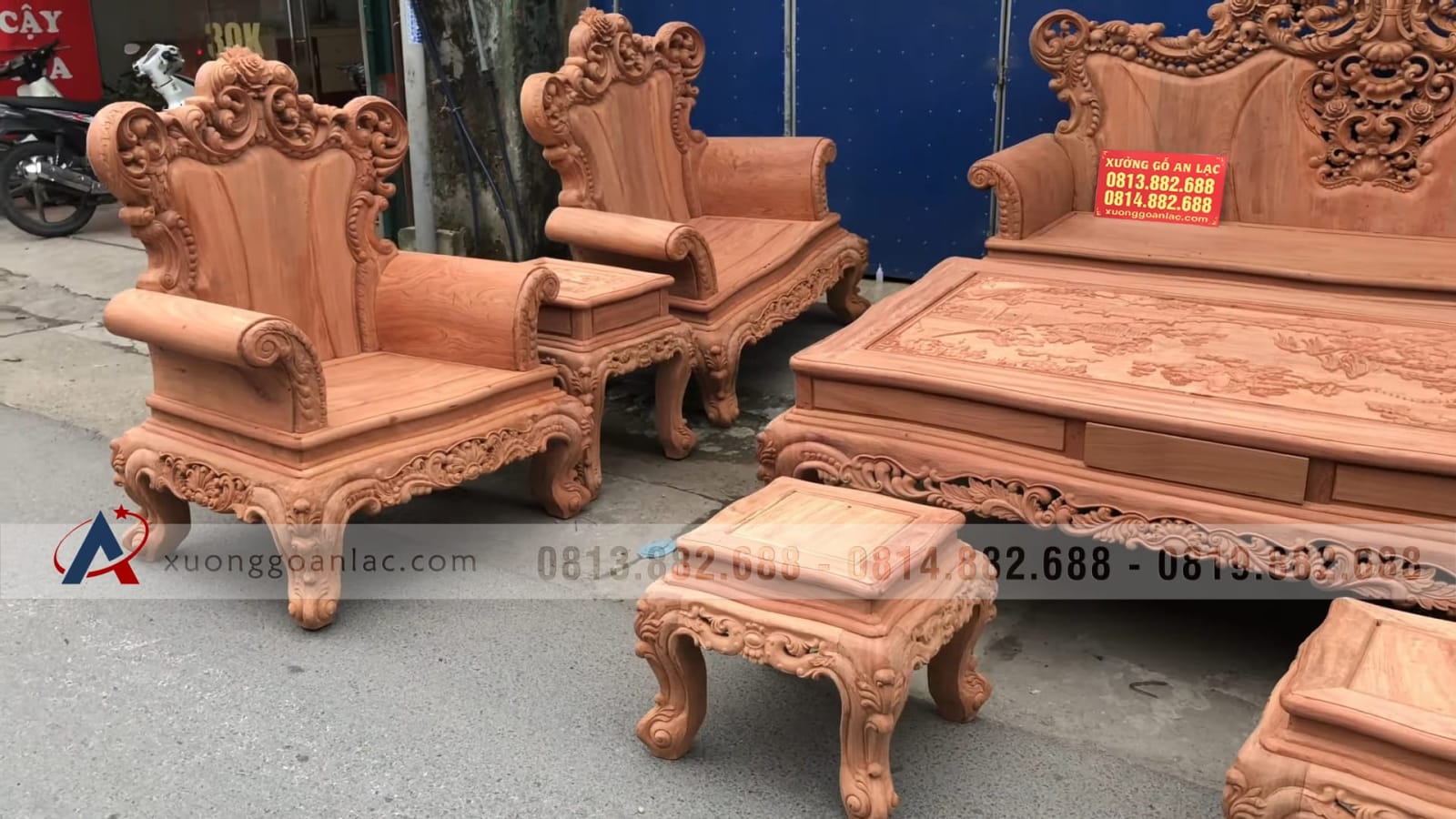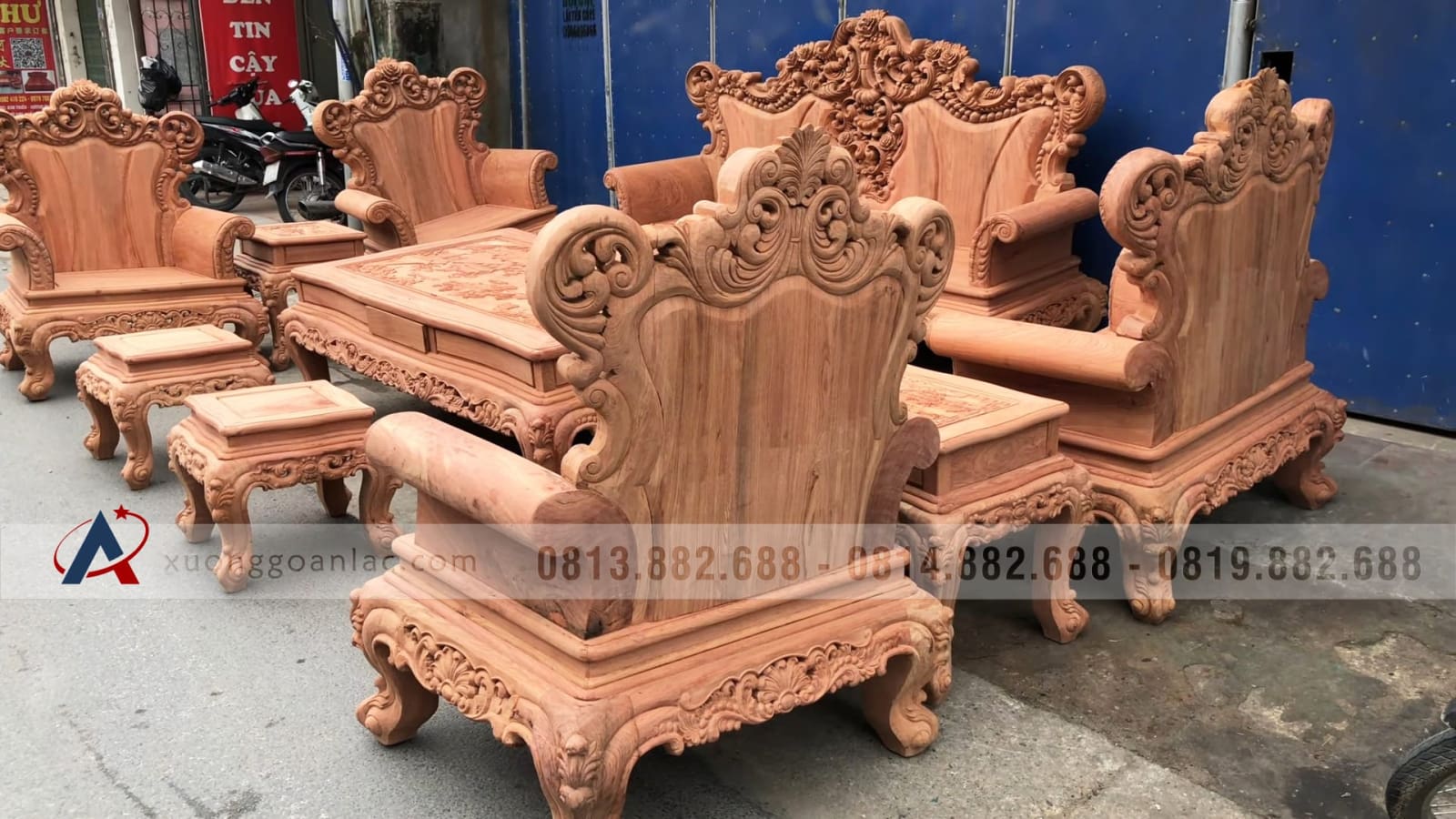 Hoàn thiện xong phần mộc bộ bàn ghế phòng khách mẫu Hoàng Gia Louis nguyên khối gỗ hương đá chân 14 bộ 10 món cho anh Hải ở Hưng Yên. Bộ Hoàng gia của anh Hải là hàng tay đặc nguyên khối, chương liền tựa đặc nguyên khối dày 10cm, khuôn tranh 4cm, ván 2cm; thuộc phân khúc hàng cao cấp của xưởng gỗ An Lạc.
