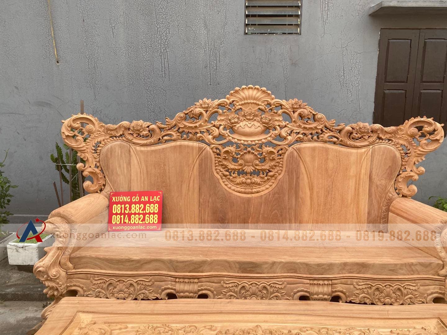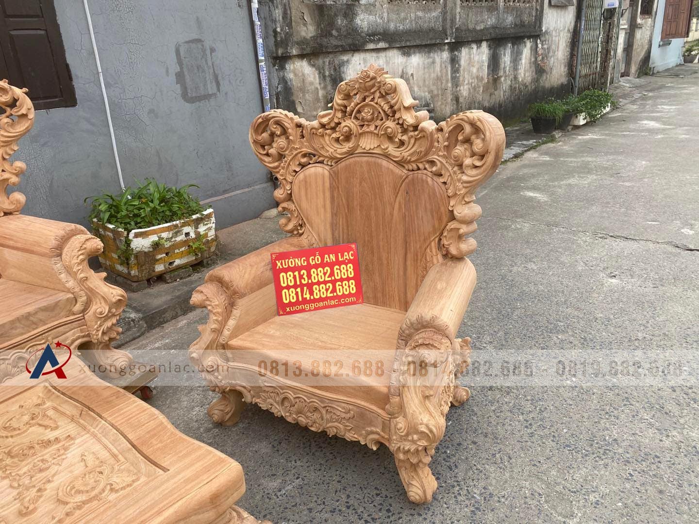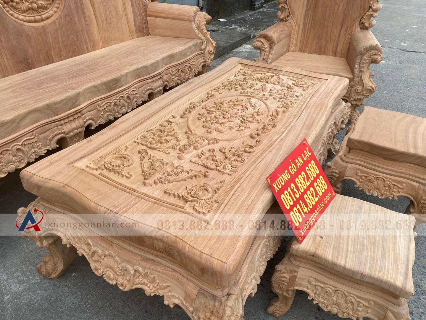 Hoàn thiện xong phần mộc bộ hoàng gia nguyên khối gỗ gõ đỏ cho gia đình anh Quang ở TP Vinh (Nghệ An). Bộ sản phẩm được thiết kế theo phong cách hoàng gia tân cổ điển với các chi tiết đục thủ công hoa lá tây đặc trưng vô cùng tinh xảo và bắt mắt. Với số lượng 6 món được bố trí dạng chữ U để phù hợp với phòng khách sâu hẹp bề ngang nhà anh Quang.