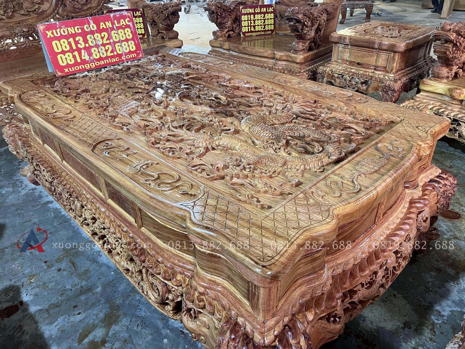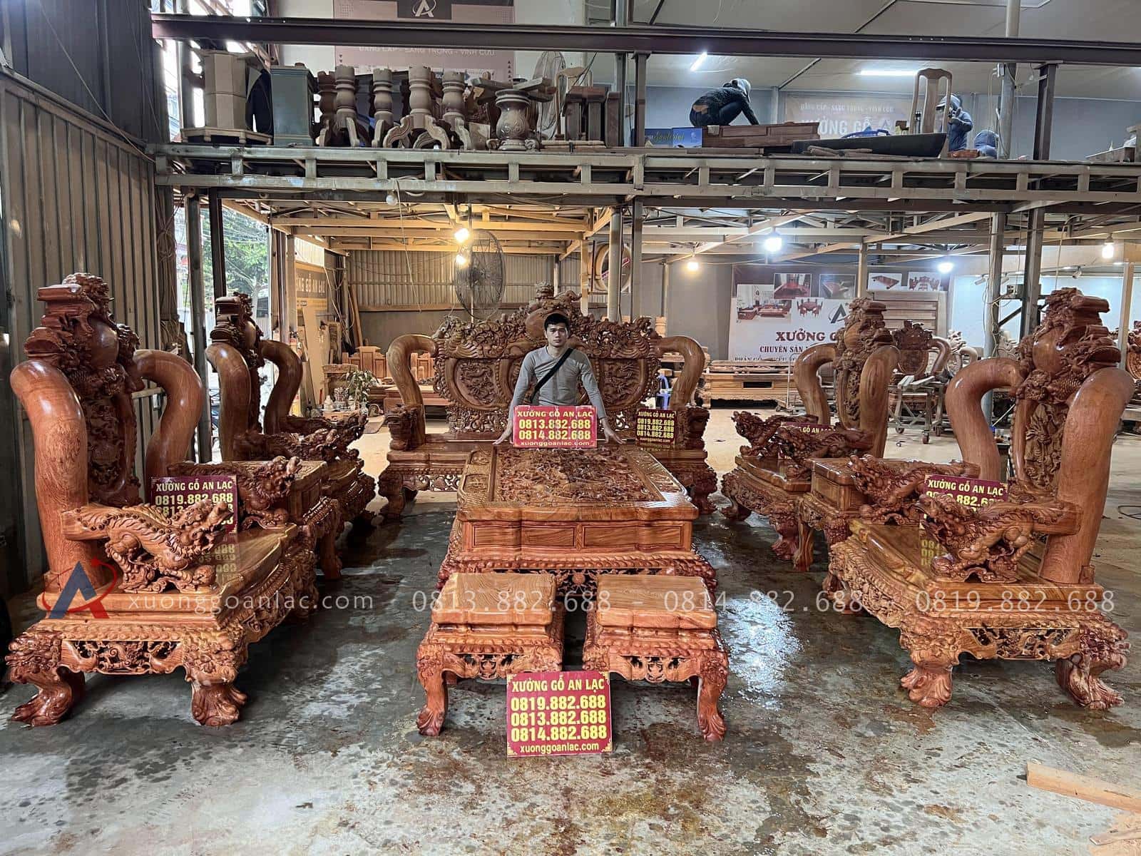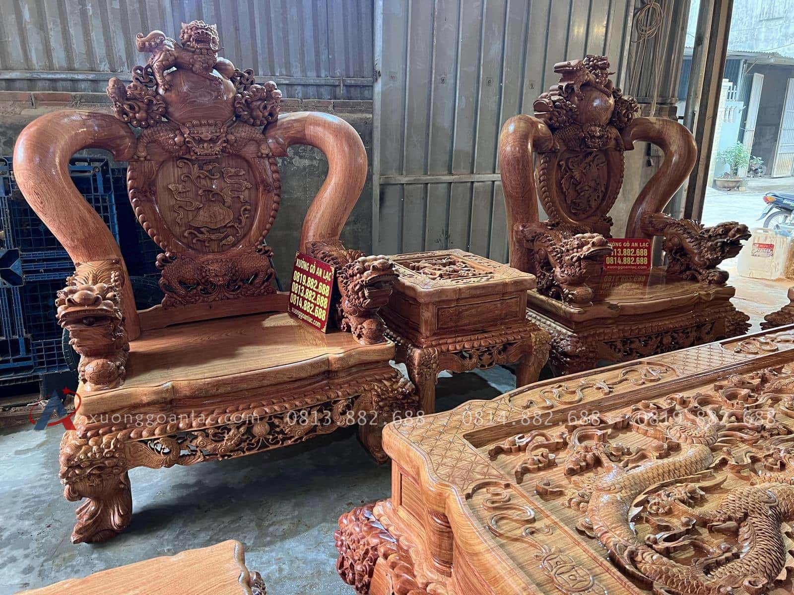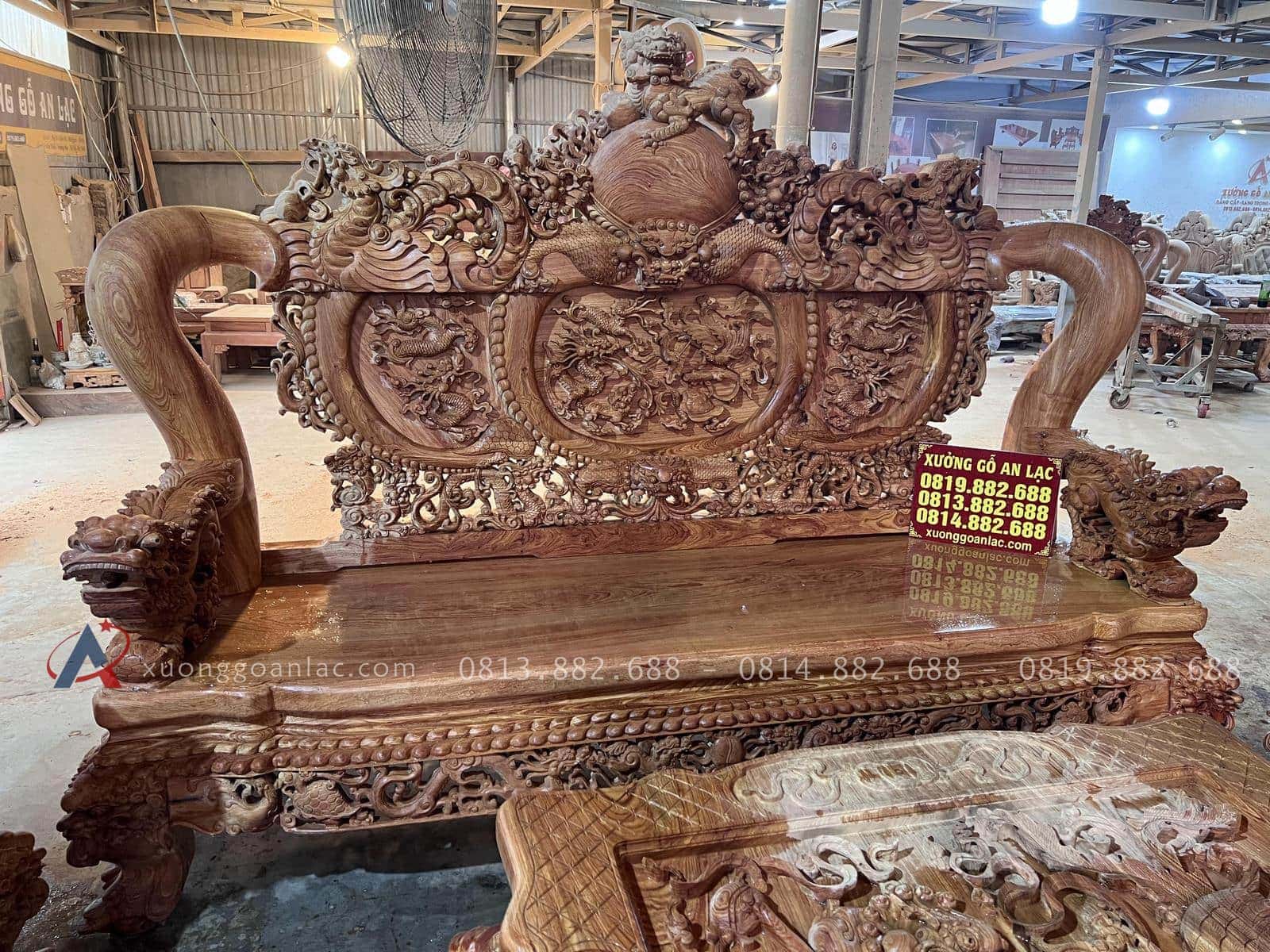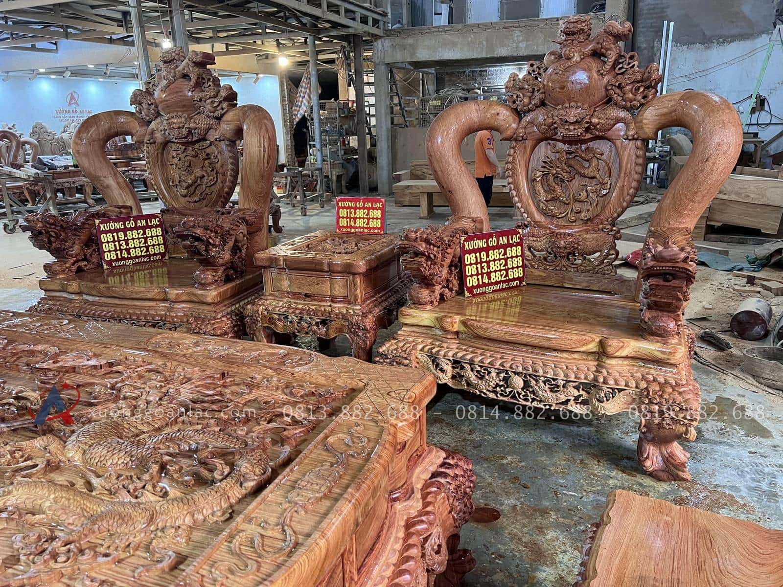 Xưởng Gỗ An Lạc rất vinh hạnh khi được anh Cẩn một khách hàng siêu Vip ở Hòa Bình tin tưởng giao trọng trách chế tác một bộ bàn ghế nghê đỉnh hàng siêu phẩm vô cùng hoành tráng để chuẩn bị cho căn nhà sắp hoàn thiện của gia đình. Anh được người quen giới thiệu nên rất tin tưởng đặt hàng online mà không cần đến trực tiếp xưởng cho đến khi xuống kiểm tra kí nhận mộc anh đã vô cùng bất ngờ về độ hoàn mỹ của sản phẩm và ứng ý vô cùng. Mời các bác cùng ngắm nhìn những hình ảnh thực tế được chúng tôi chụp lại ngay tại xưởng.