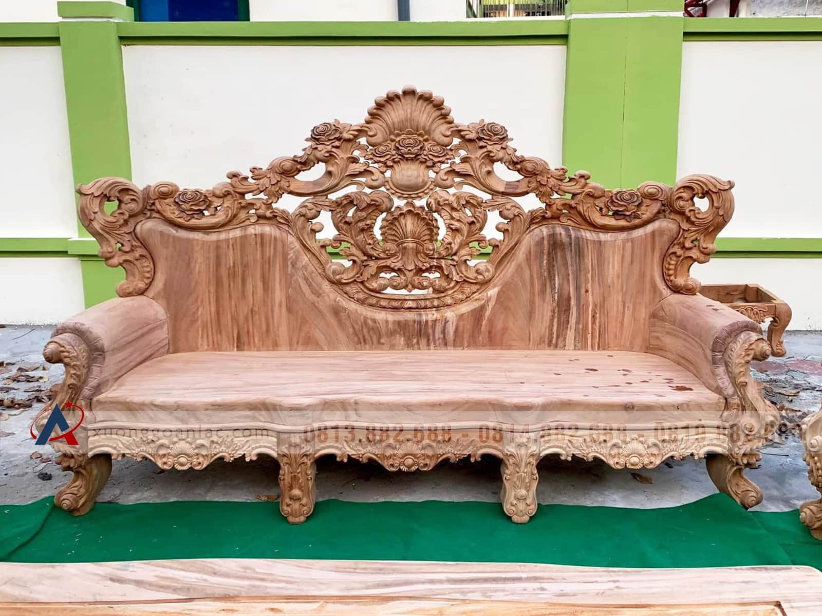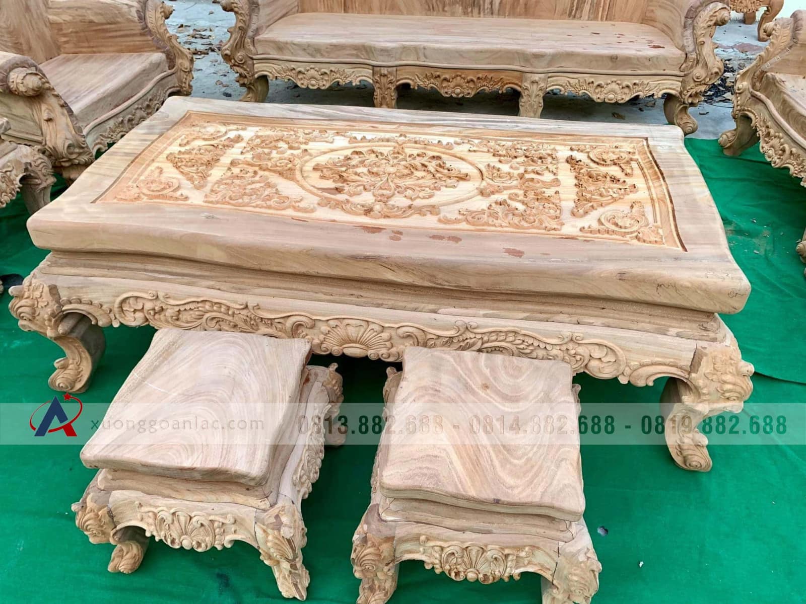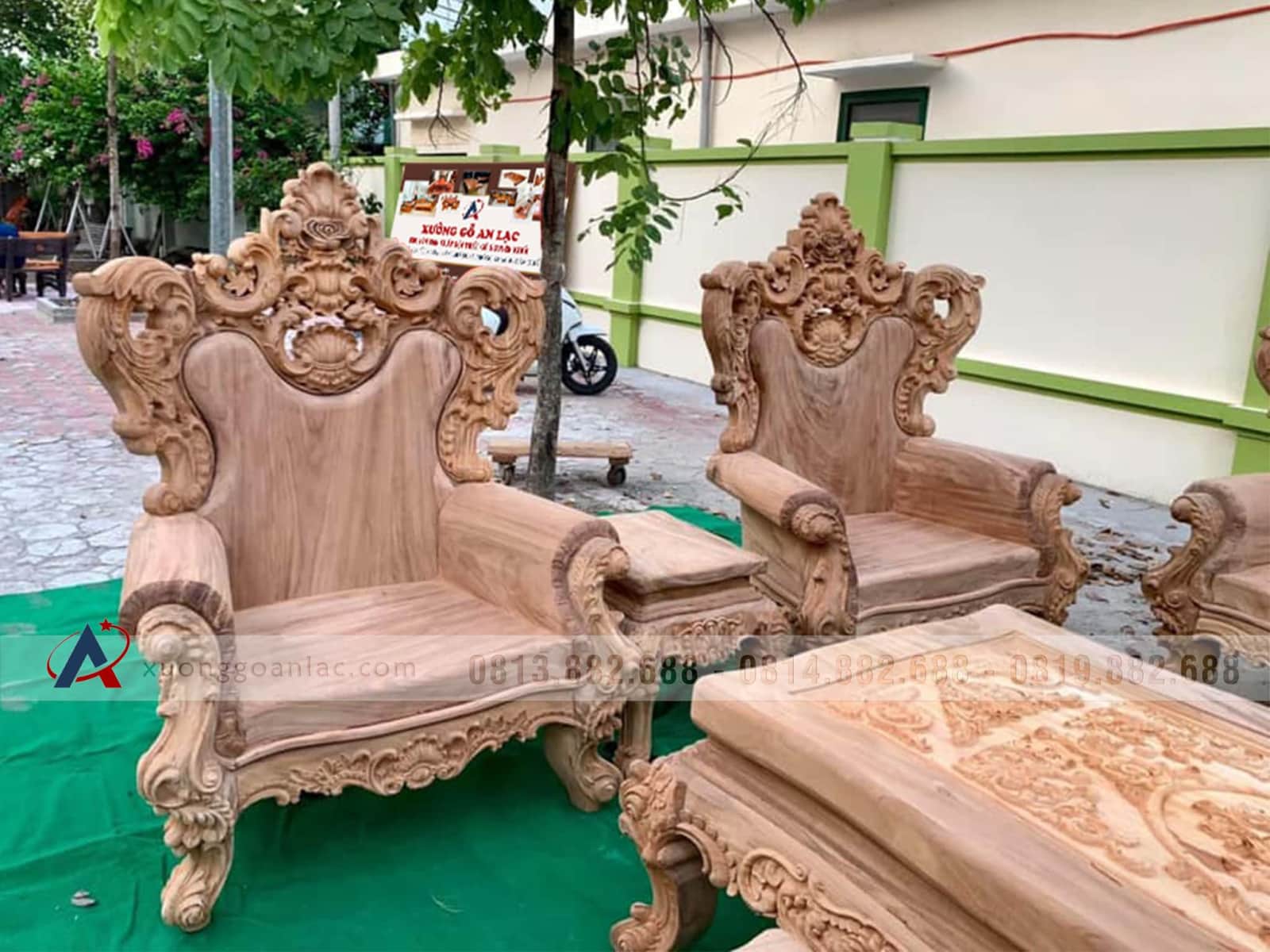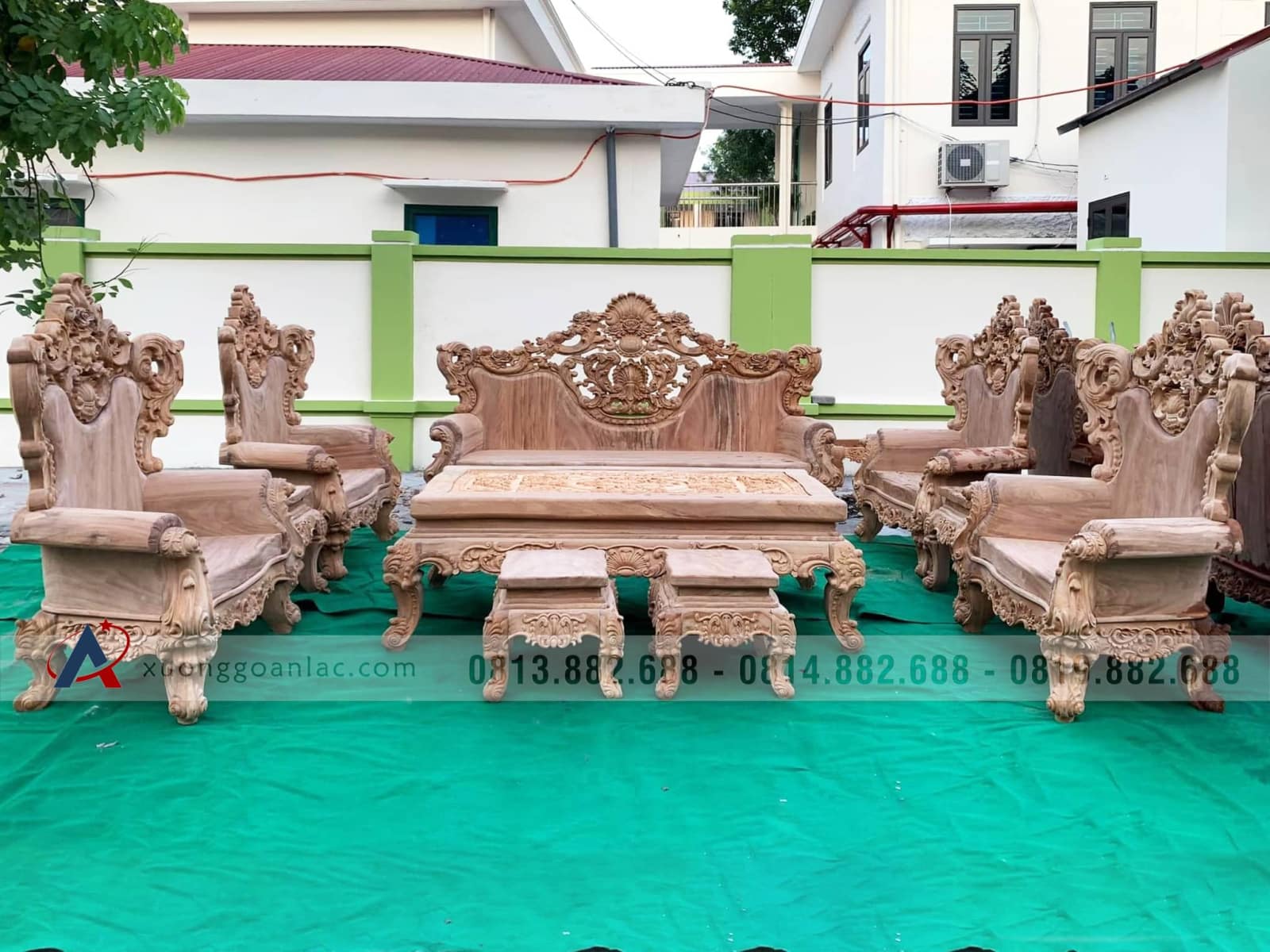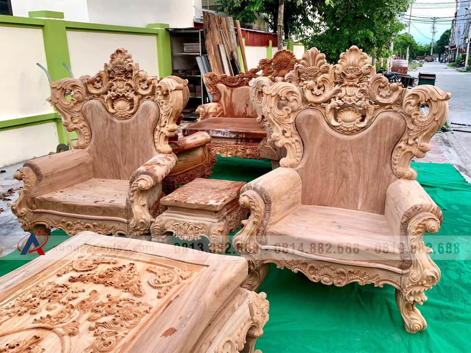 Hoàn thiện xong phần mộc bộ bàn ghế phòng khách mẫu Hoàng Gia Louis nguyên khối gỗ gõ đỏ bộ 6 món cho anh Tài ở Quảng Ninh. Bộ Hoàng gia của anh Tài là hàng tay đặc nguyên khối, chương liền tựa đặc nguyên khối dày 10cm, mặt bàn mặt ghế cũng là nguyên khối dày 10cm, thuộc phân khúc hàng cao cấp của xưởng gỗ An Lạc.