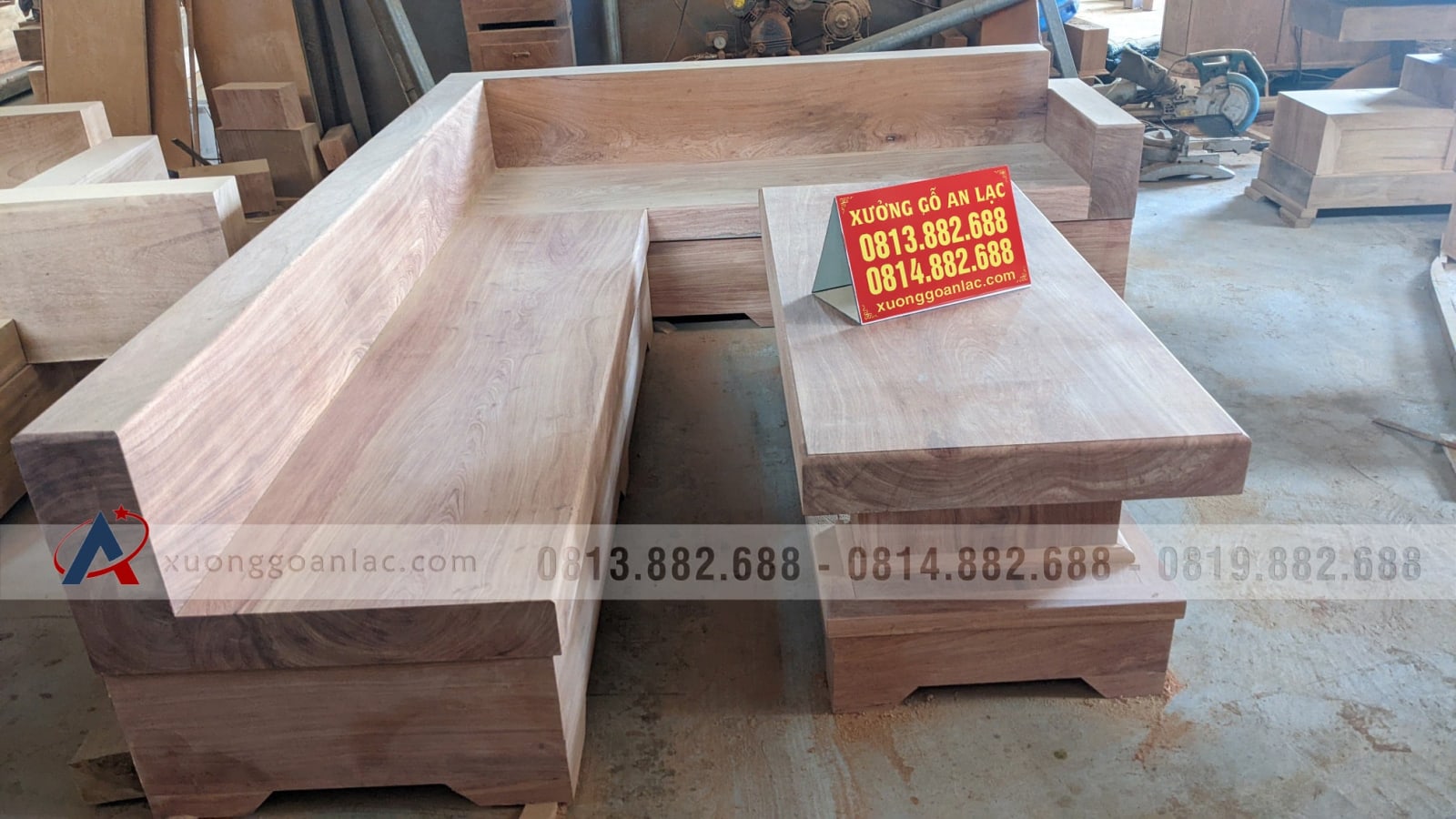 - Sofa gỗ nguyên khối dạng góc chữ L vô cùng trẻ trung và hiện đại với hai chiều ghế nguyên khối dài rộng có tựa ghế và tay vịn nguyên khối dày 15cm
