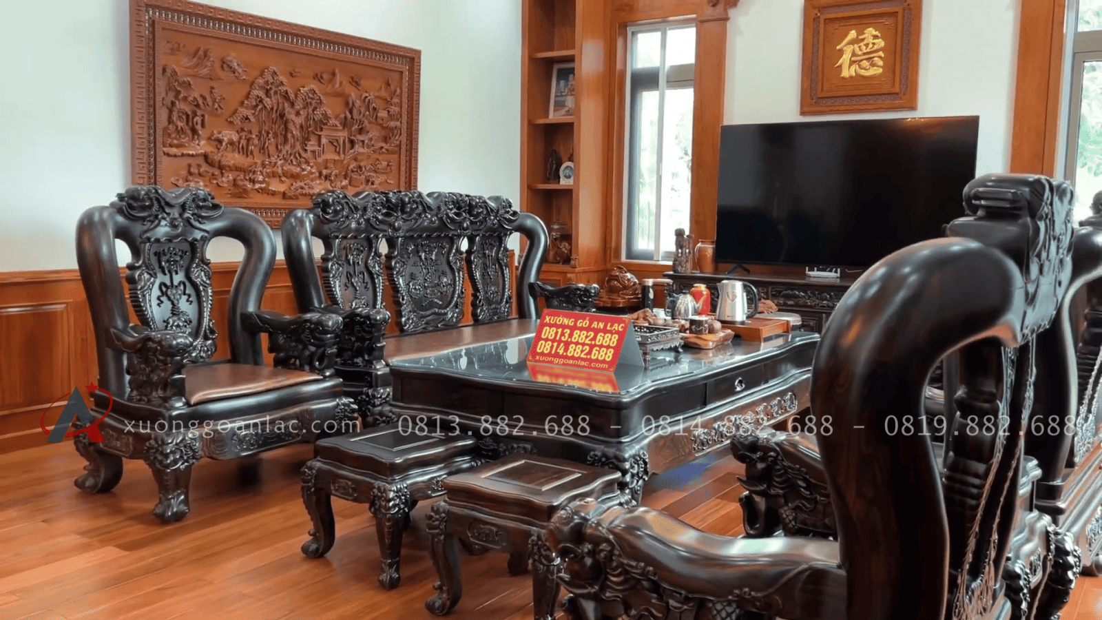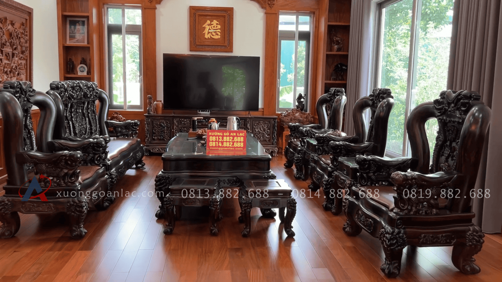 Xưởng Gỗ An Lạc rất vinh hạnh khi được gia đình anh Định ở Hải Dương tin tưởng đặt hàng online một bộ bàn ghế quốc voi hàng cột 16 gỗ mun hoa Lào cao cấp cực sang trọng. Mời các bác cùng chiêm ngưỡng thành phẩm được xưởng chụp lại trong chính không gian phòng khách của gia đình anh Định.
