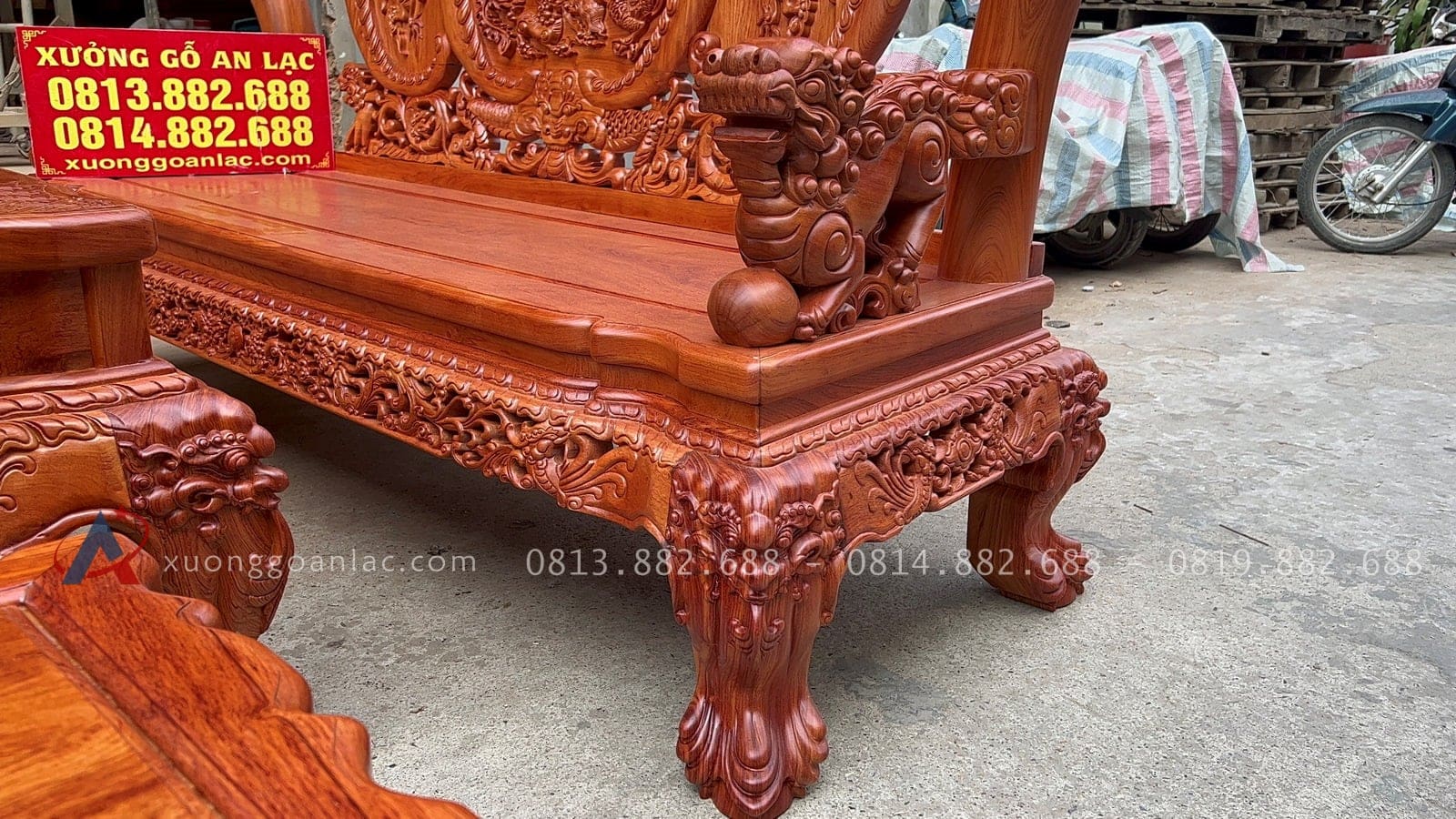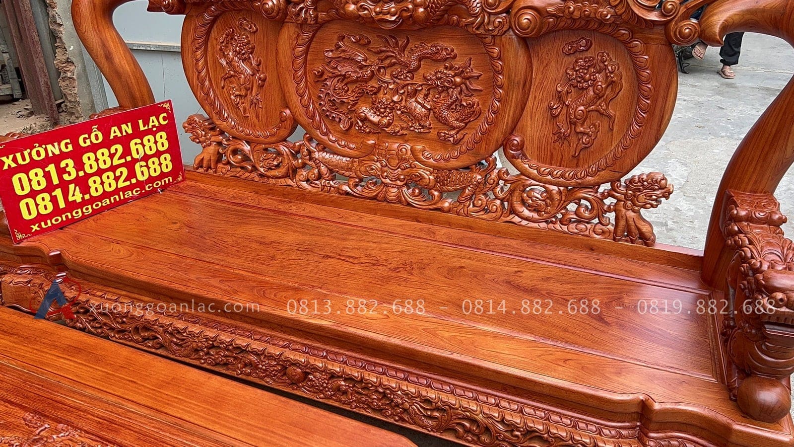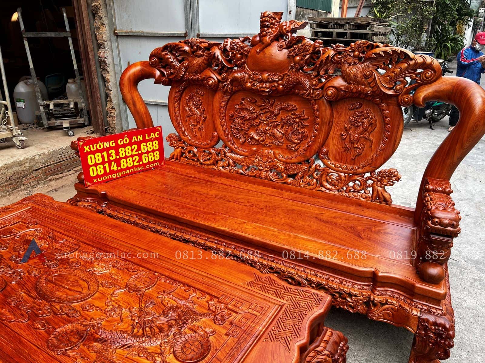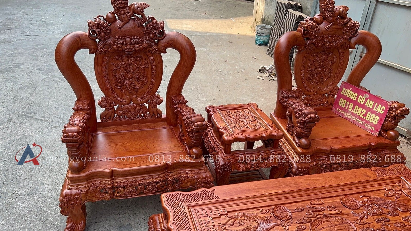 [Hoàn thiện] Bộ bàn ghế nghê đỉnh cột 12 hàng khung 5 ván 2 gỗ hương đá cao cấp