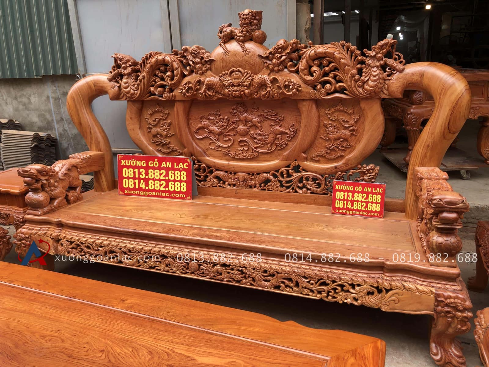 Góc chụp nghiêng giúp thấy rõ được sự sống động của những họa tiết phong thủy đỉnh cao được khắc họa sâu sắc trên chiếc ghế dài trong bộ nghê bảo đỉnh của xưởng gỗ An Lạc chế tác cho bác Ánh