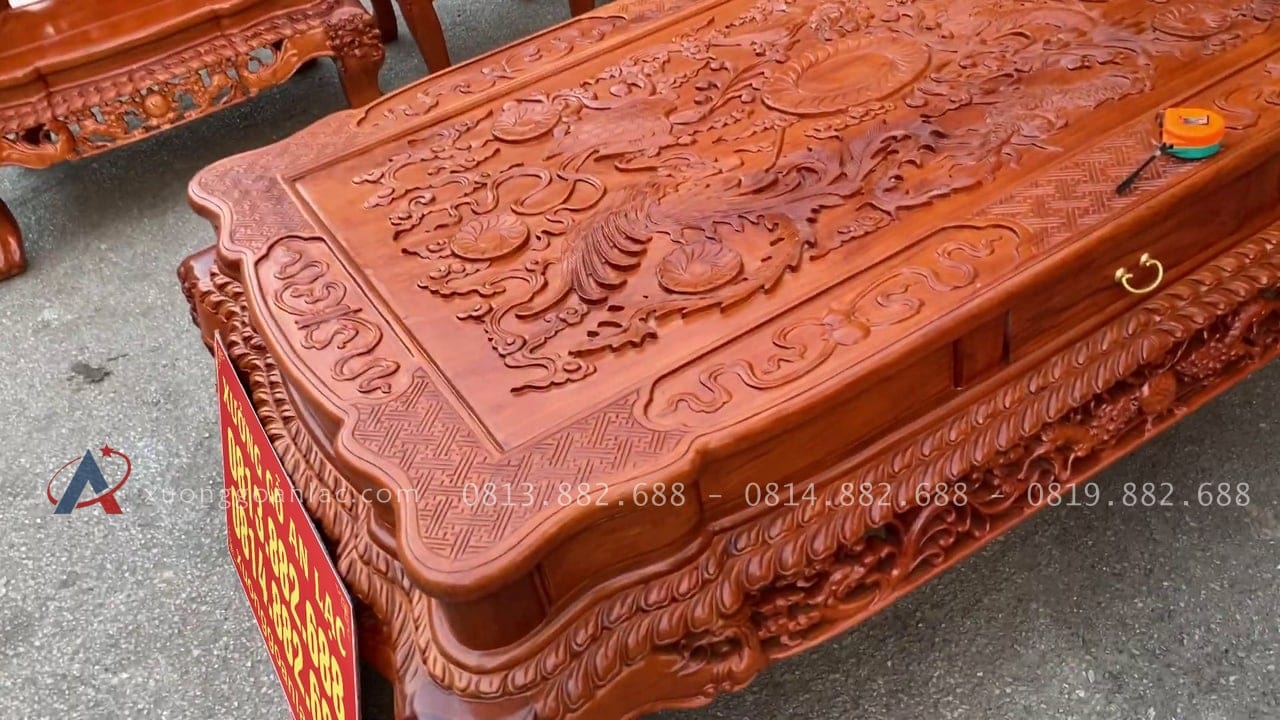 - 1 bàn trà chữ nhật: rộng 1m05 dài 1m85. phủ bì 1m2 x 2m02, đục tay kênh bong, ngăn kéo 2 bên, mặt bàn dày 3cm , khuôn tranh 4cm, yếm vanh cong, đục tứ diện.