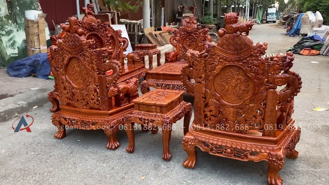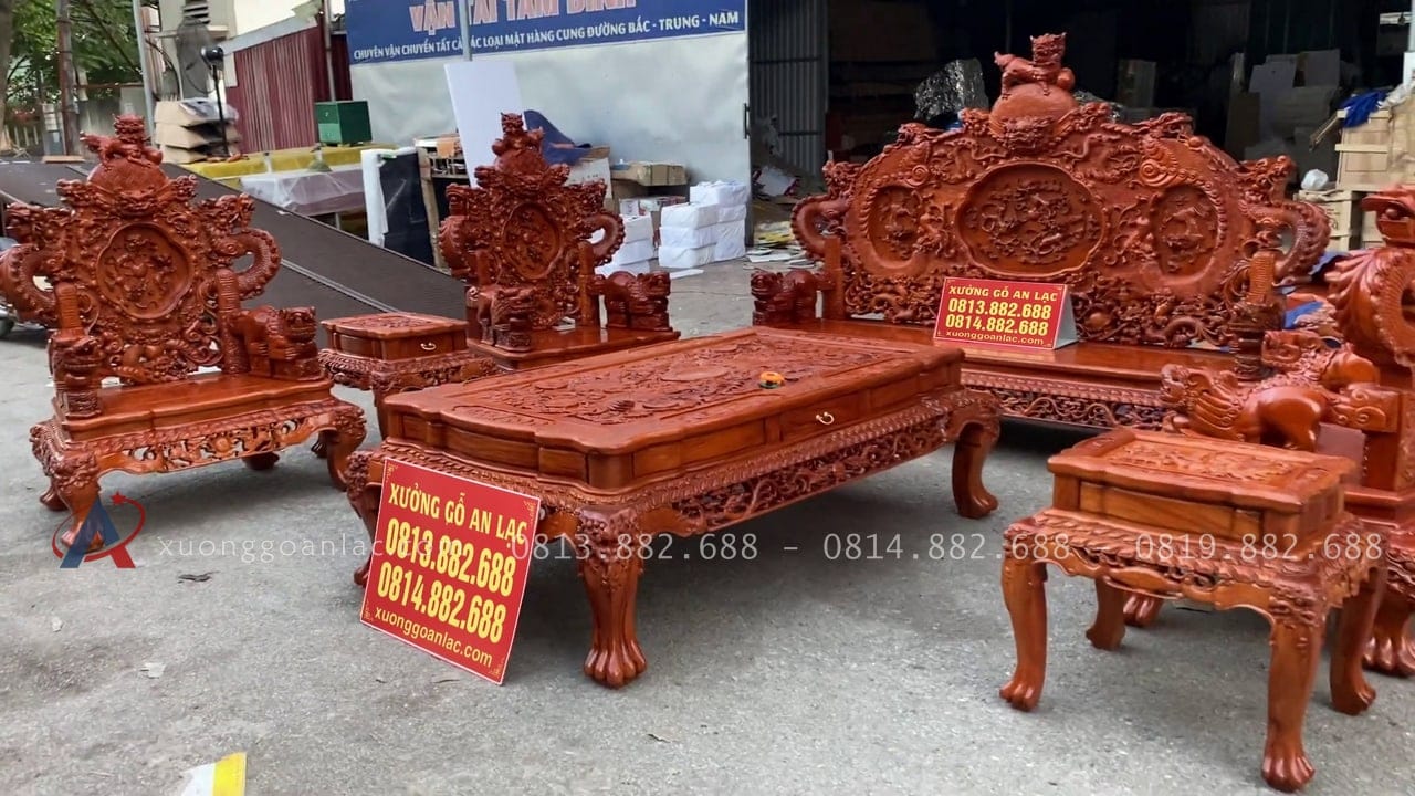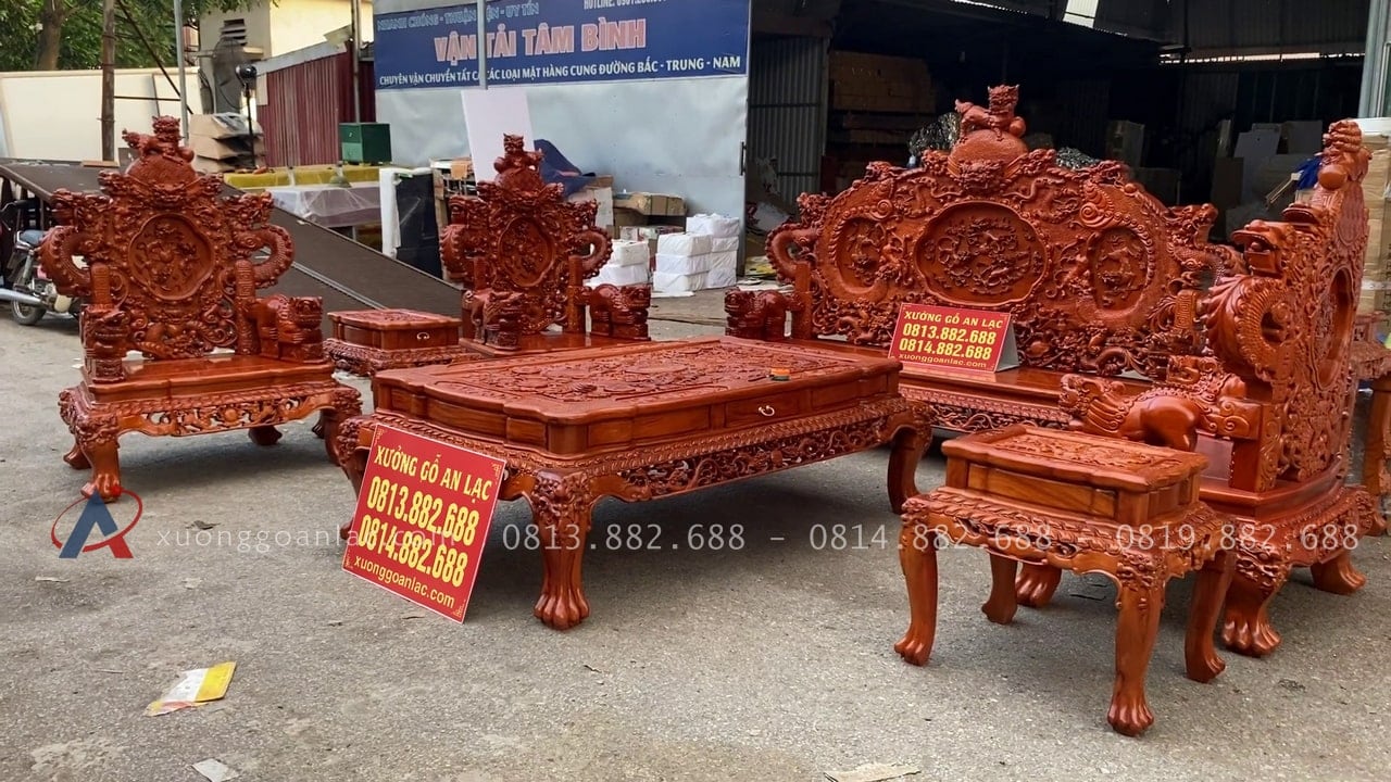 Mẫu sản phẩm chị Hiền đặt là một bộ bàn ghế gỗ gõ đỏ mẫu rồng đỉnh chân 14 hàng cao cấp đục tay tinh xảo gồm 8 món vô cùng hoánh tráng và sang trọng: