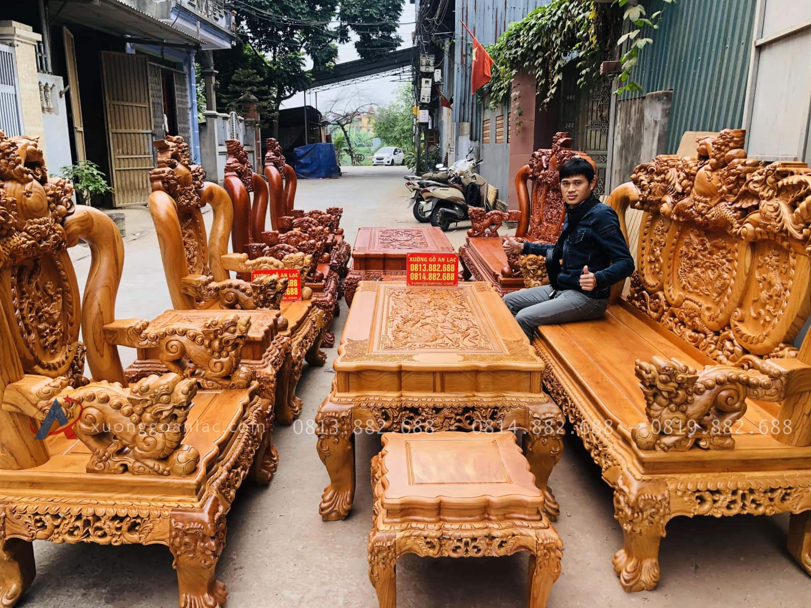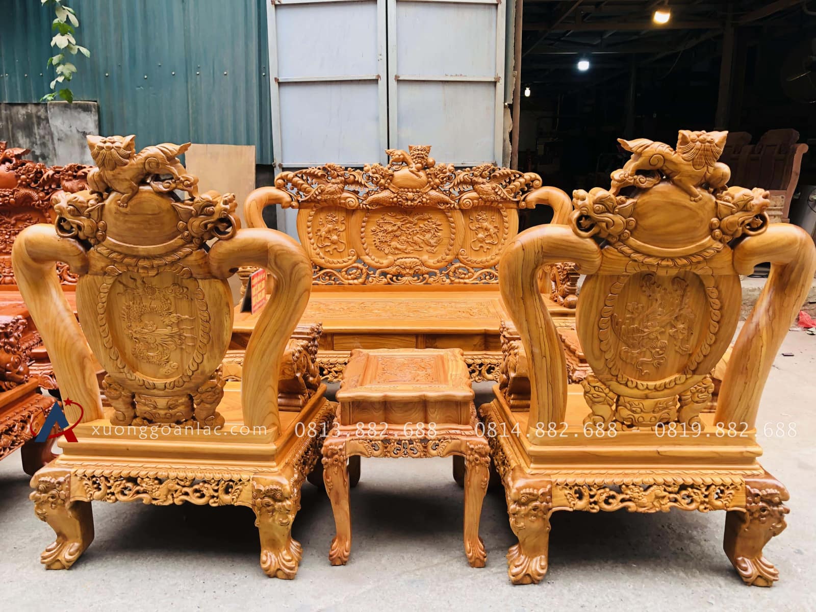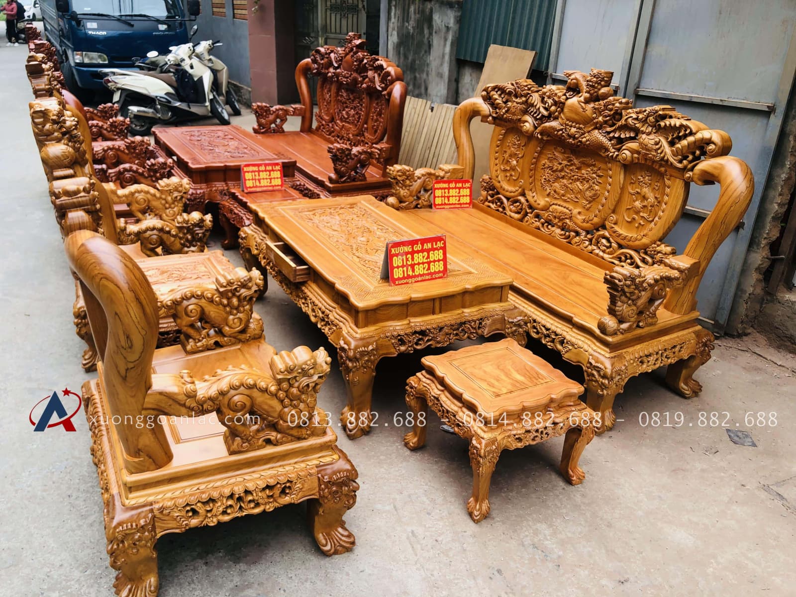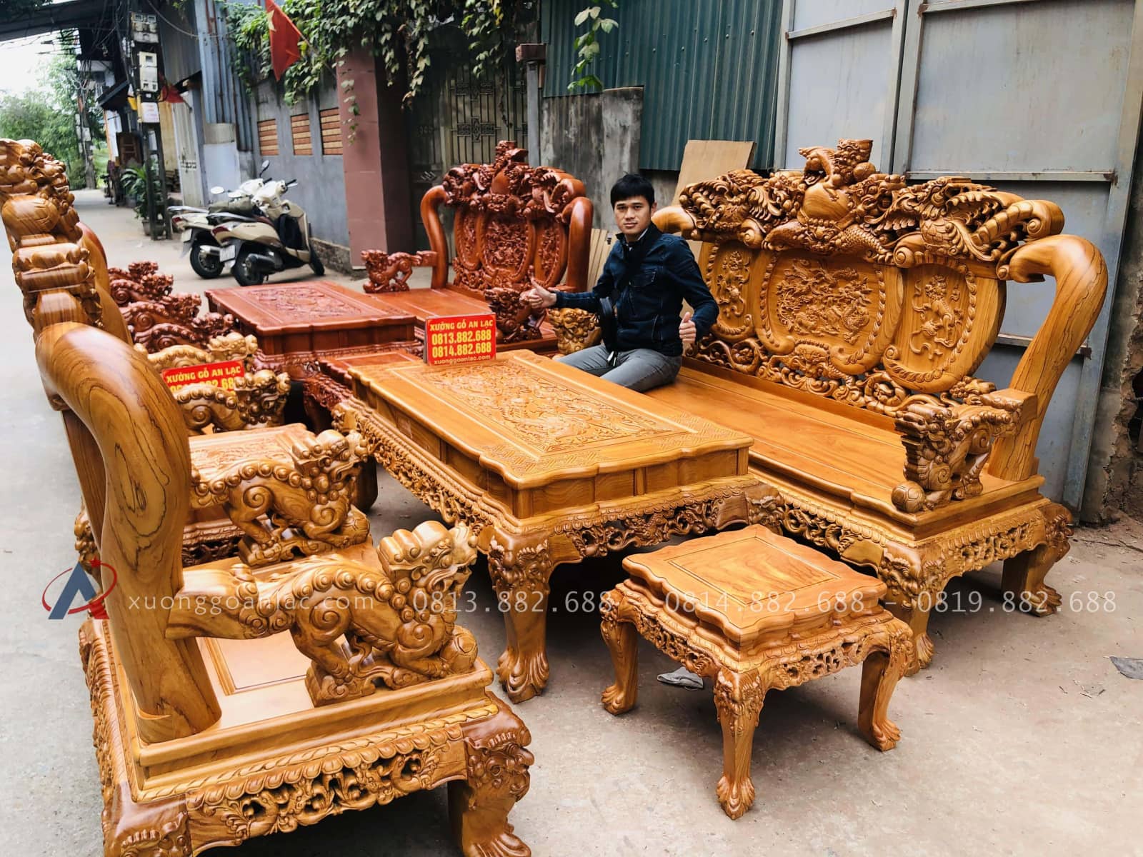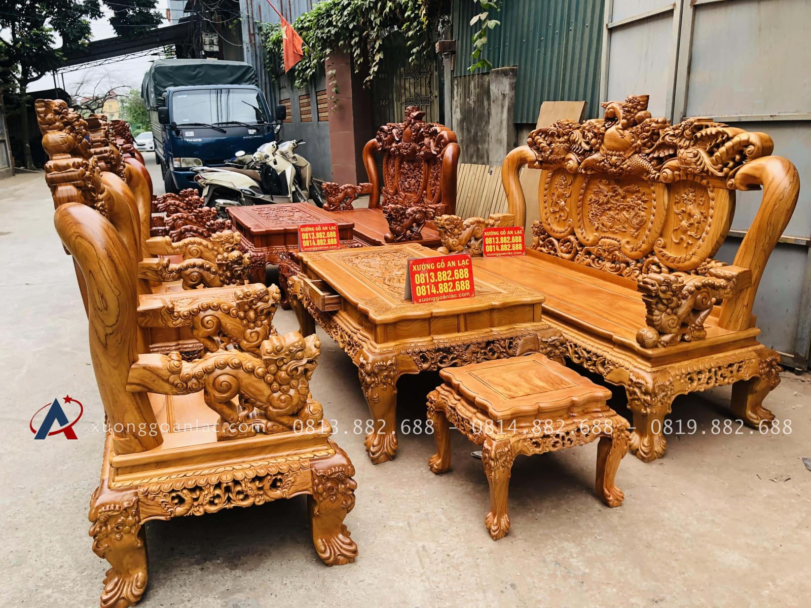 Hoàn thiện và chuẩn bị bàn giao bộ bàn ghế phòng khách mẫu minh quốc nghê cho gia đình chú Thanh ở Nghệ An. Bộ sản phẩm được xưởng gỗ An Lạc nhận đặt hàng và làm cho chú chỉ trong vong 3 tuần, nhưng vẫn đảm bảo về chất lượng nhờ có một tiền đề vững chắc ở quy mô và một đội ngũ lớn gồm nhiều thợ mộc có tay nghề. Mời các bác cùng tham khảo: