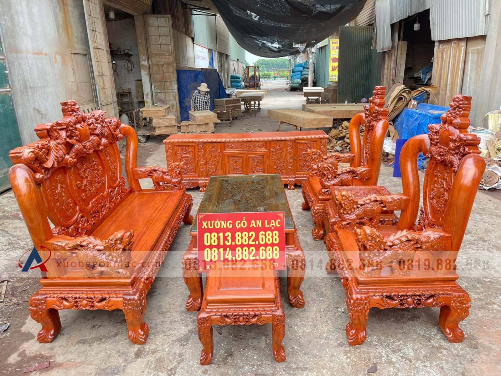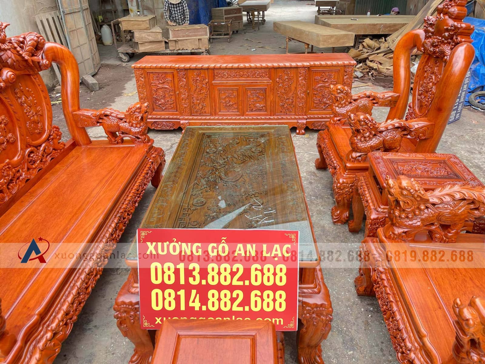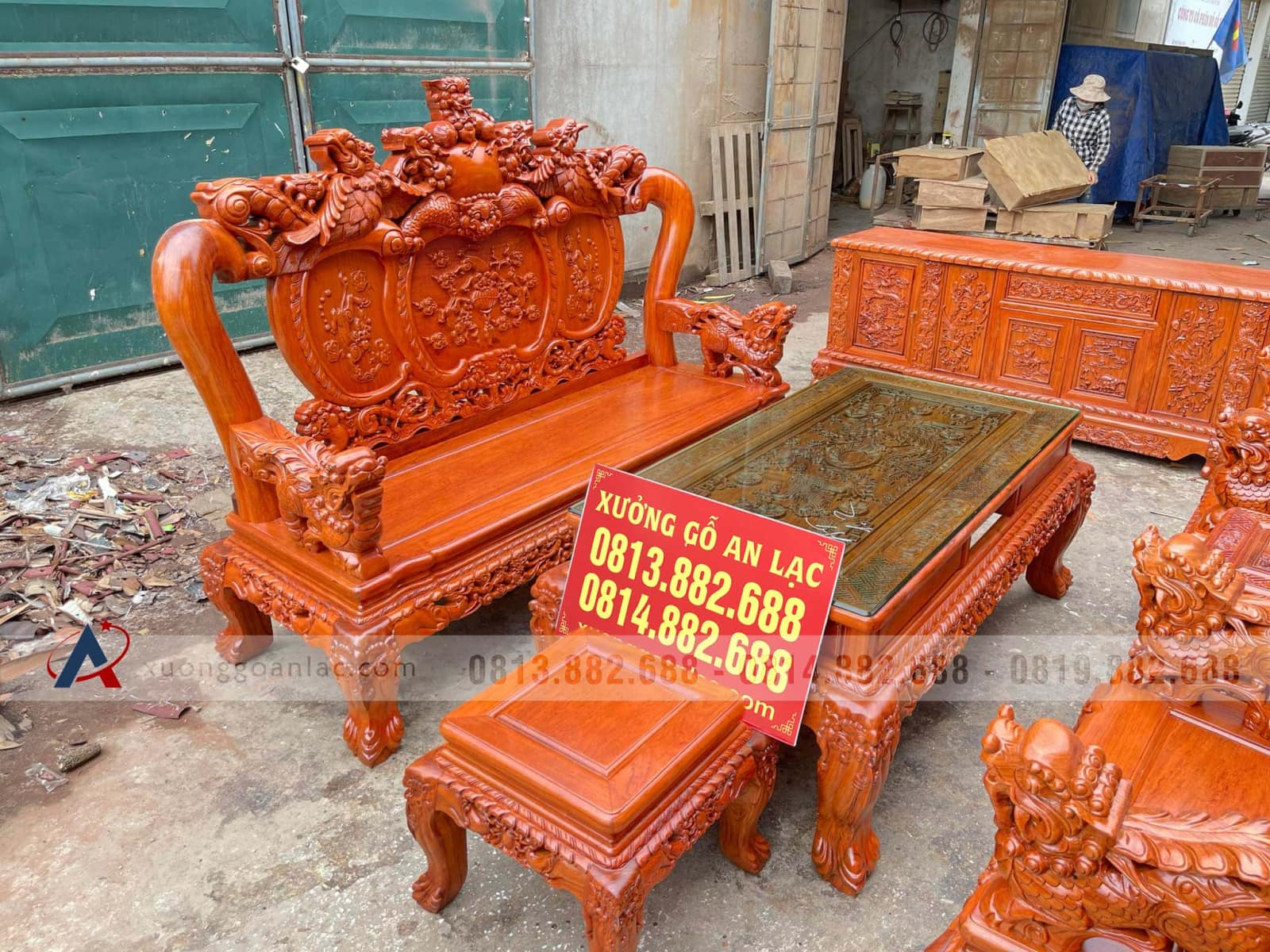 [Hoàn thiện] Combo bàn ghế Nghê Phượng 6 món tay 12 và kệ tivi Rồng 2m4 gỗ hương đá