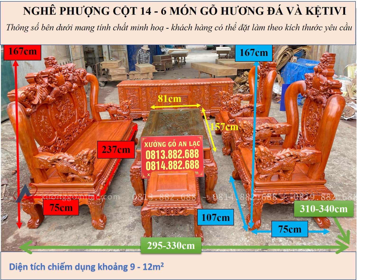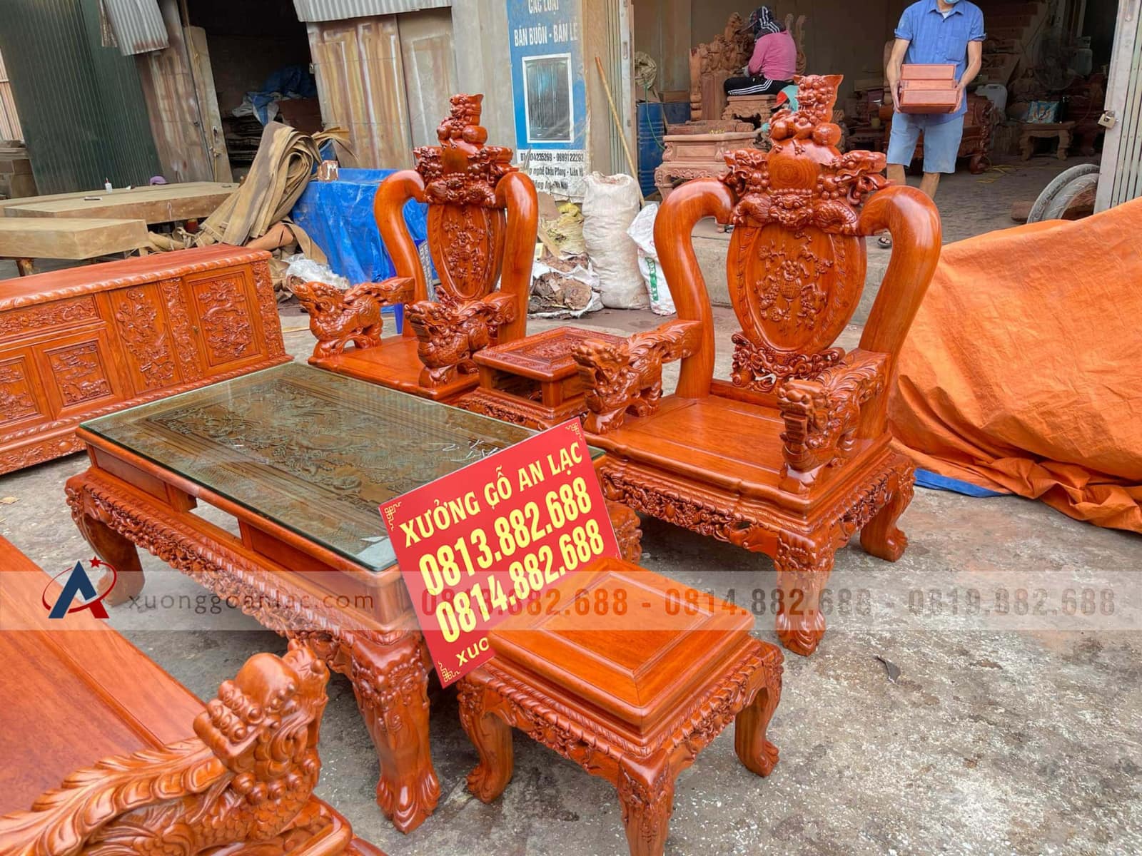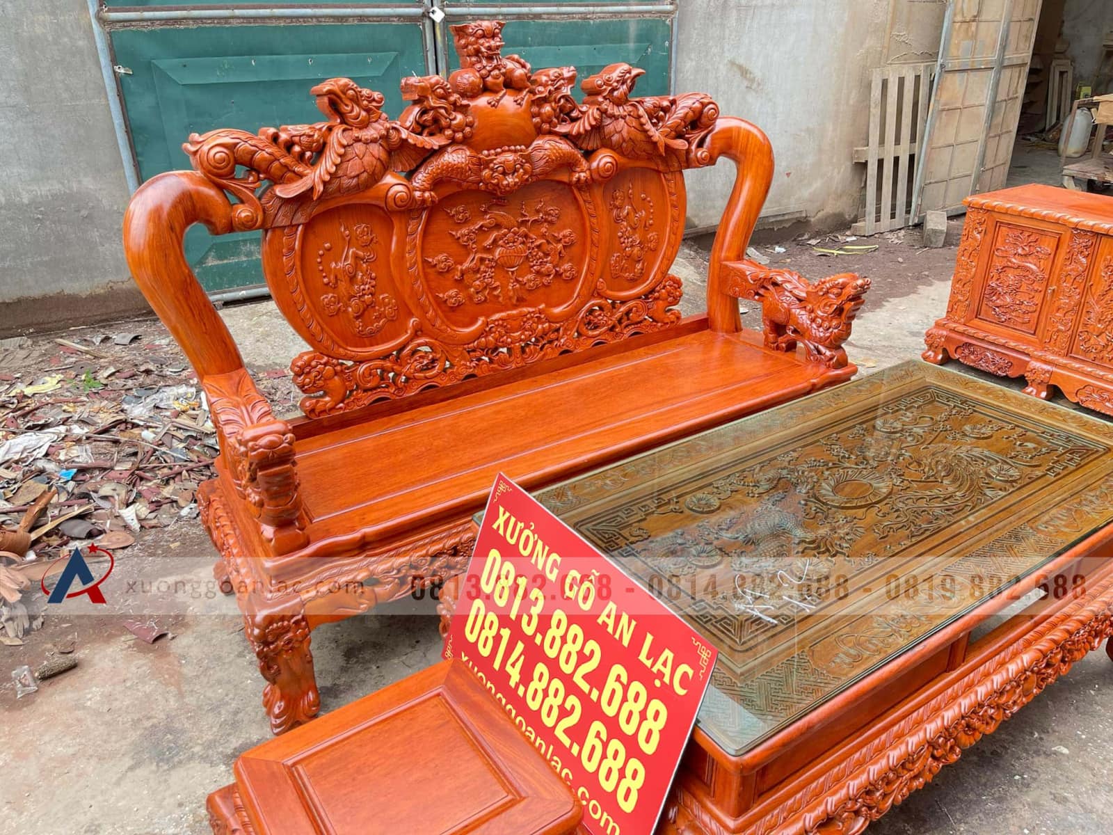 [Hoàn thiện] Combo bàn ghế Nghê Phượng 6 món tay 12 và kệ tivi Rồng 2m4 gỗ hương đá