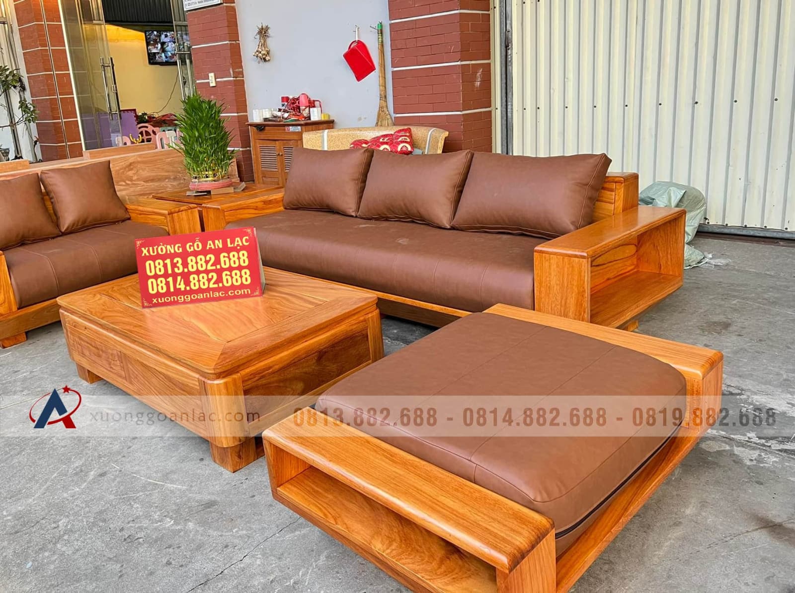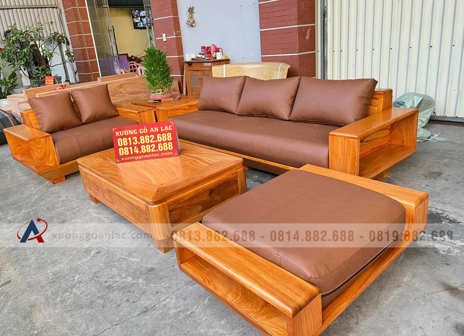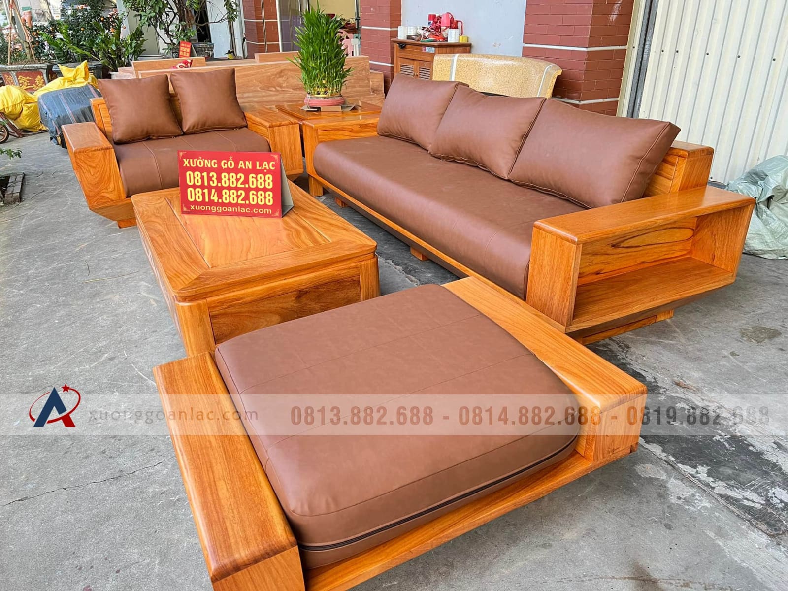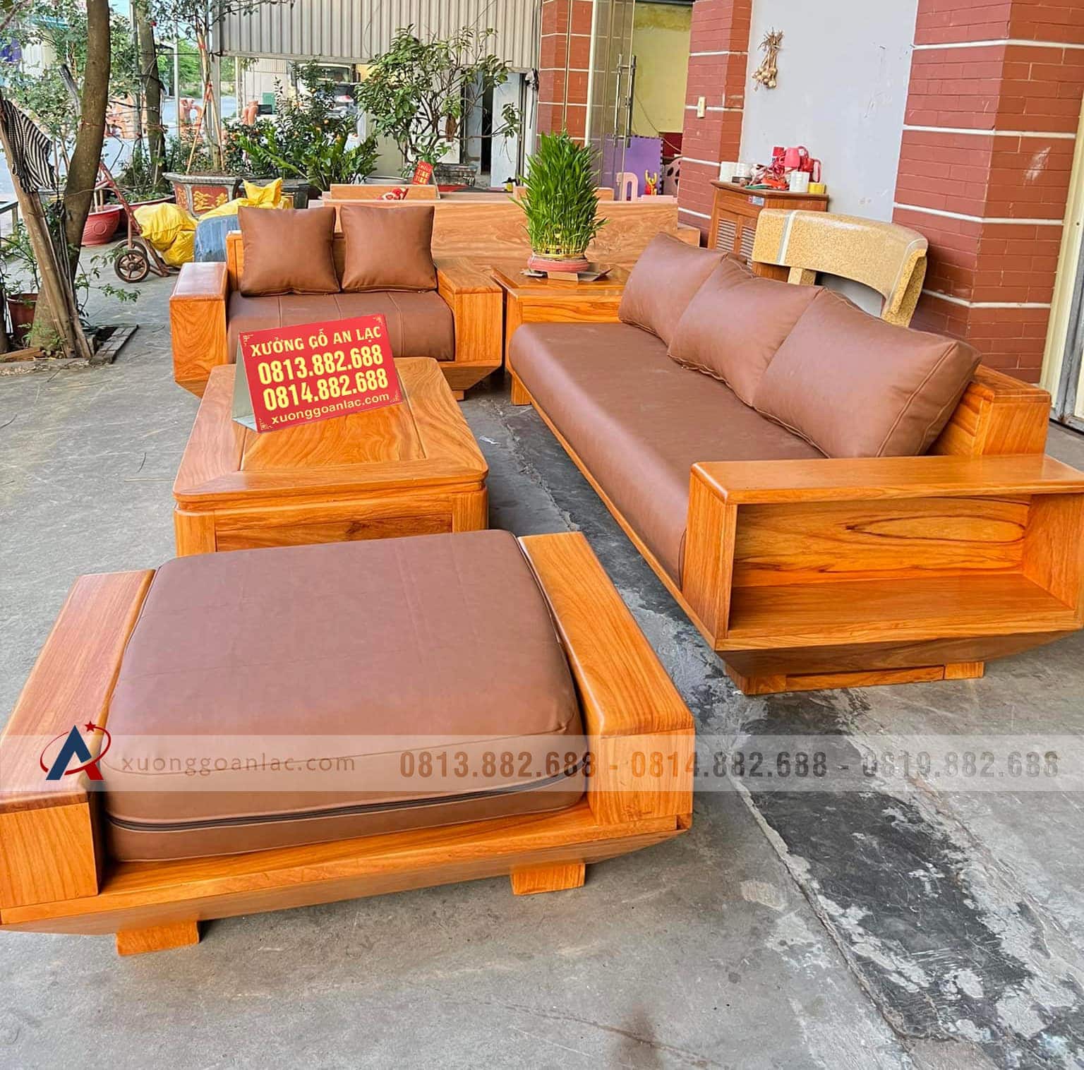 Bộ sofa hiện đại 5 món (1 đoản 2m3x80, 1 ghế đôi, 1 bàn, 1 đôn ngồi không tựa, 1 đôn góc) gỗ gõ đỏ của chị Bích là hàng khuôn 3 ván 1,5 giá 36.800.000 VNĐ.
