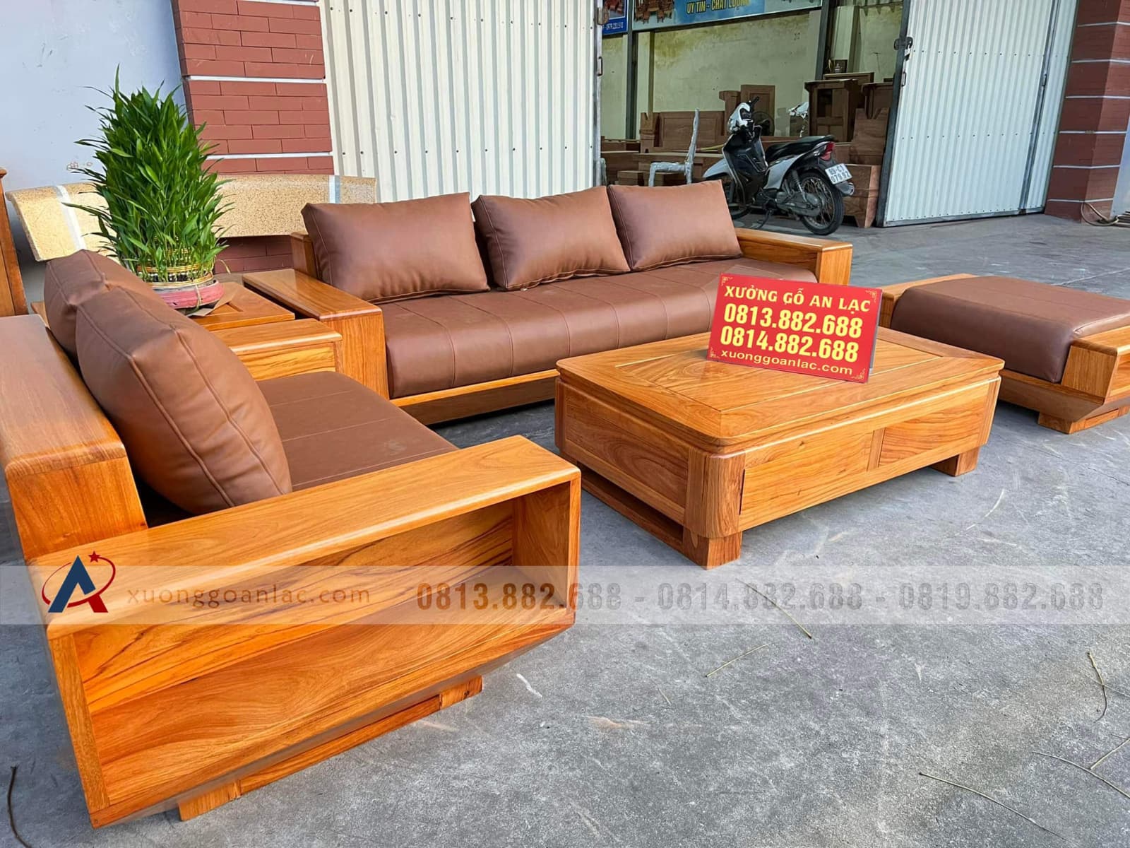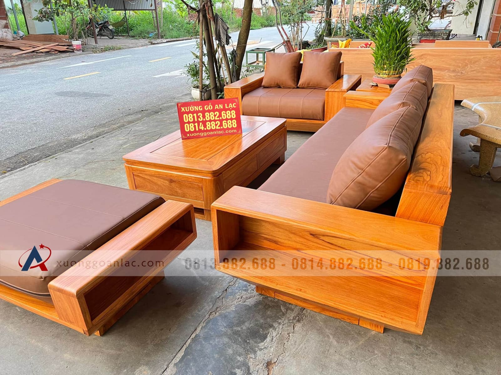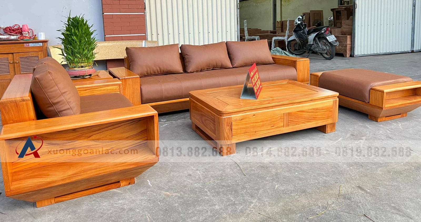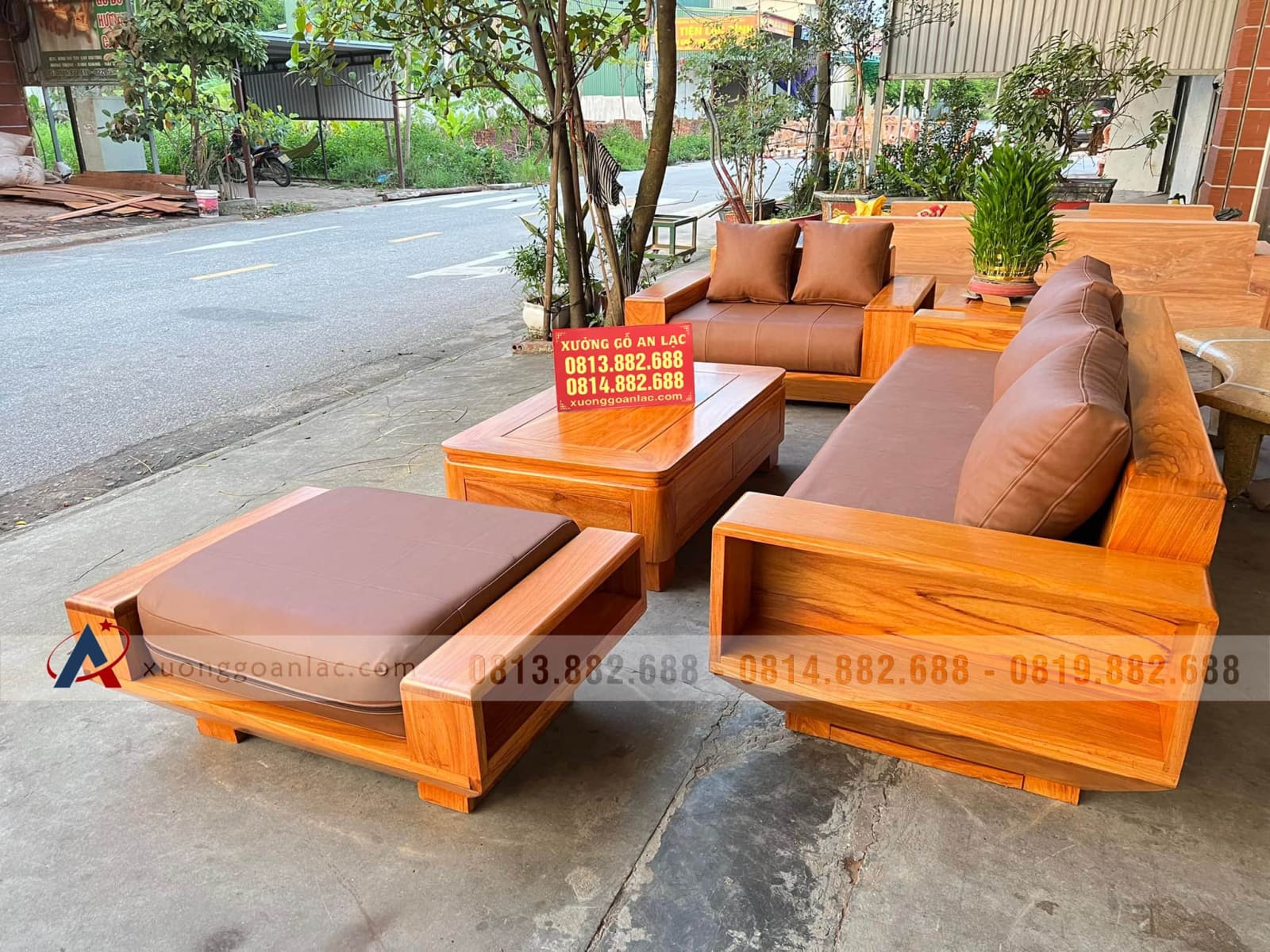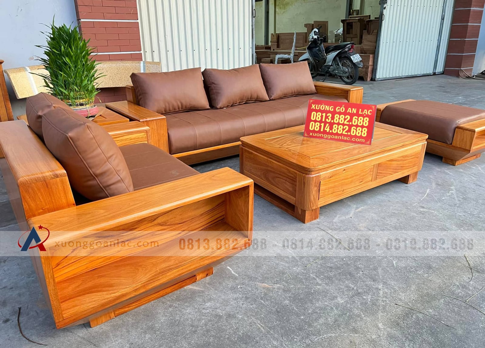 Bộ sofa hiện đại 5 món (1 đoản 2m3x80, 1 ghế đôi, 1 bàn, 1 đôn ngồi không tựa, 1 đôn góc) gỗ gõ đỏ của chị Bích là hàng khuôn 3 ván 1,5 giá 36.800.000 VNĐ.